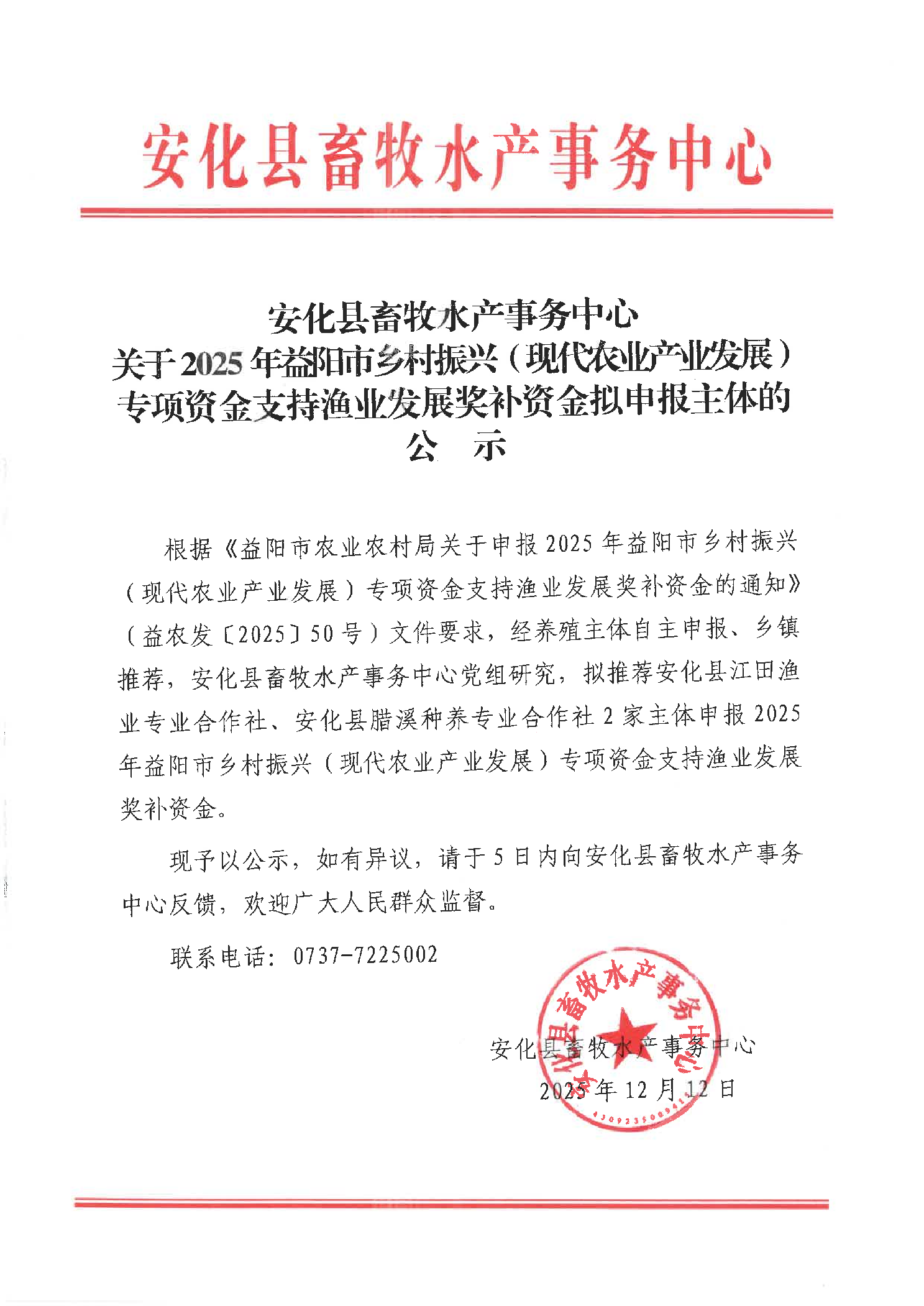 关于2025年益阳市乡村振兴(现代农业产业发展)专项资金支持渔业发展奖补资金拟申报主体的公示