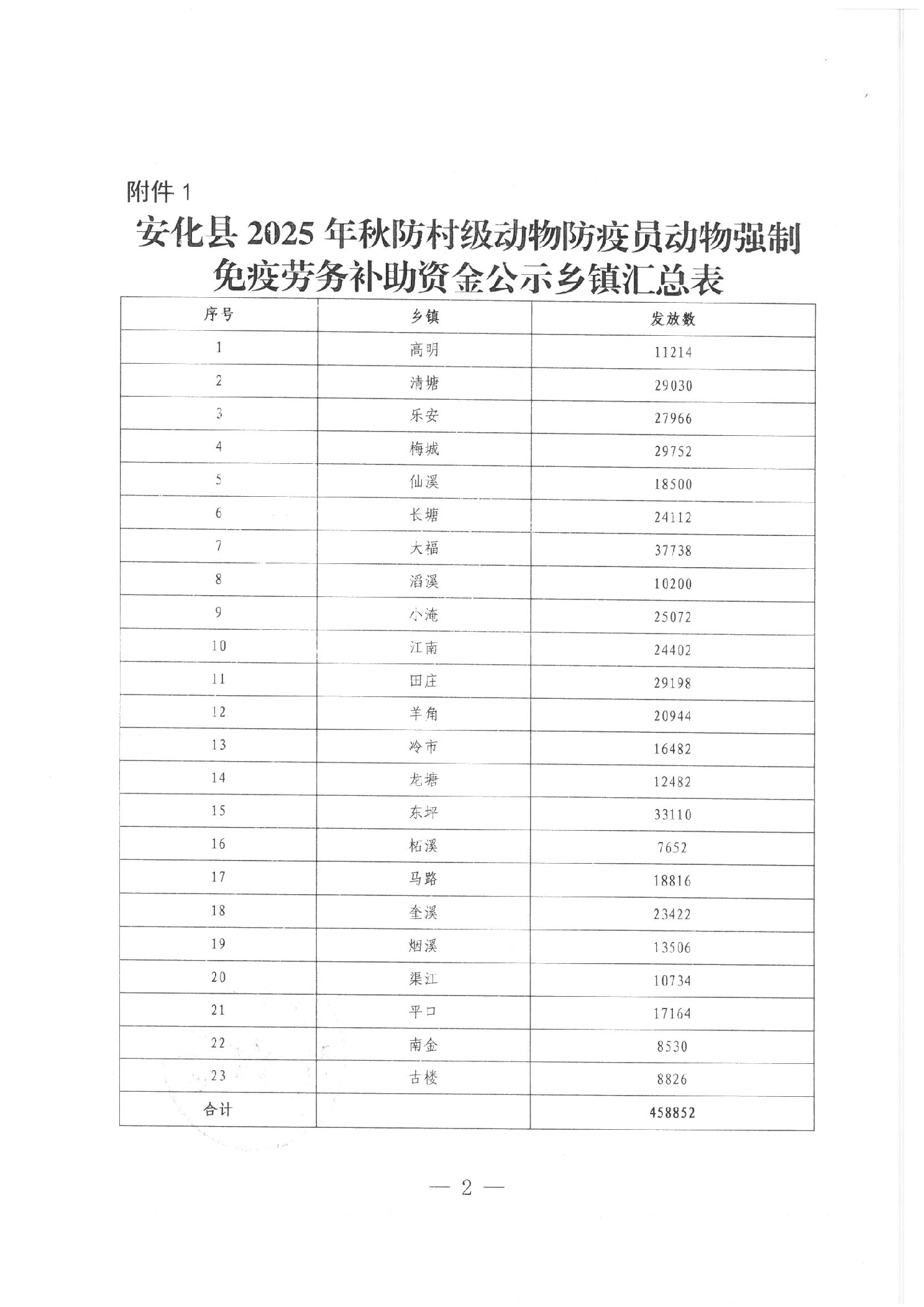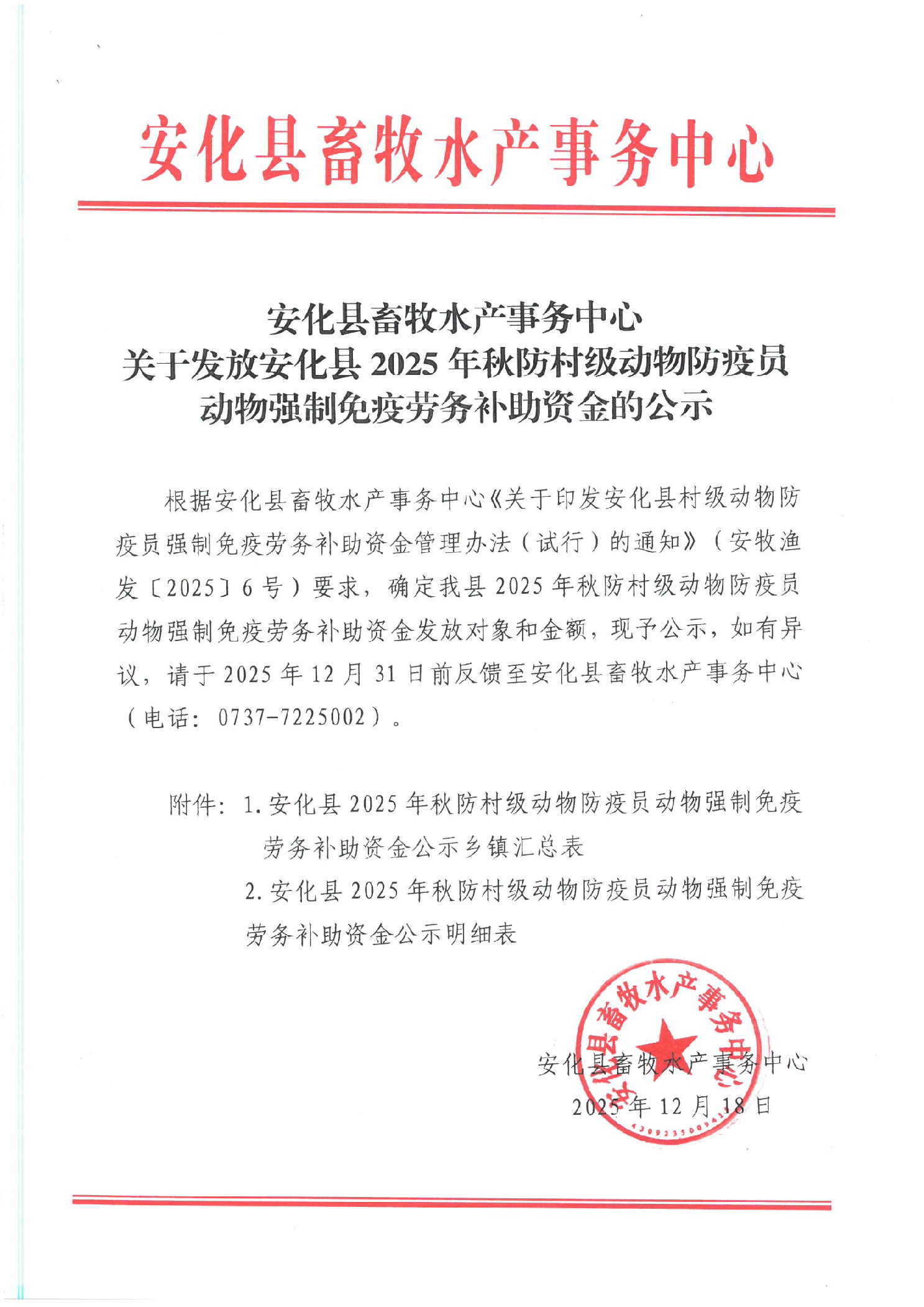 关于发放安化县2025年秋防村级动物防疫员动物强制免疫劳务补助资金的公示