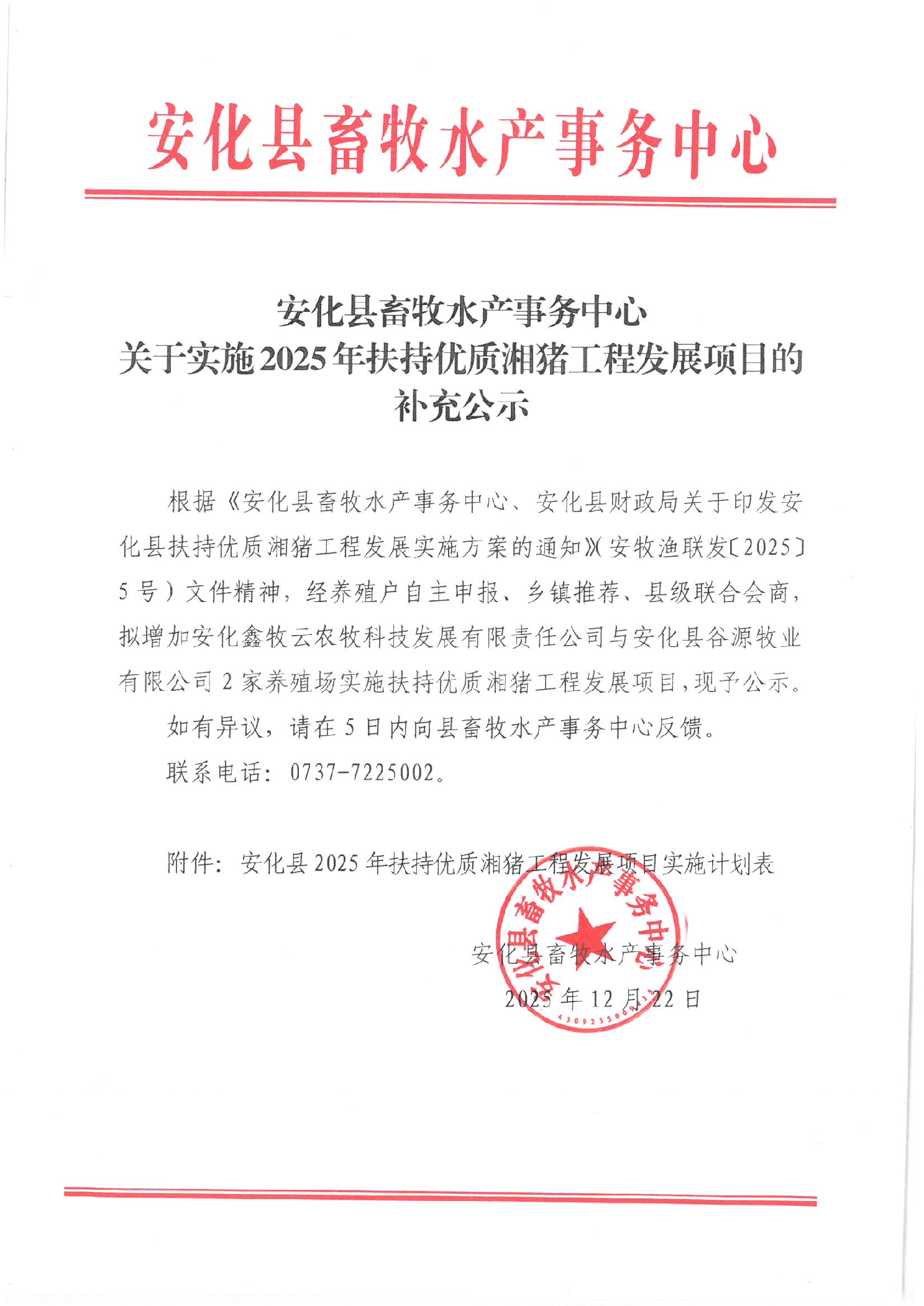 关于实施2025年扶持优质湘猪工程发展项目的补充公示