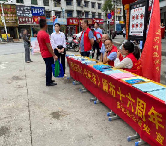 为庆祝8月28日《中华人民共和国公证法》颁布十六周年,8月27日,安化县司法局组织县公证处、县法律援助中心、梅城司法所、湖南朝晖律师事务所、梅山法律服务所工作人员在梅城镇开展宣传,推广公证服务、普及法律援助知识、进行禁毒宣传,面对面为群众提供法律服务。