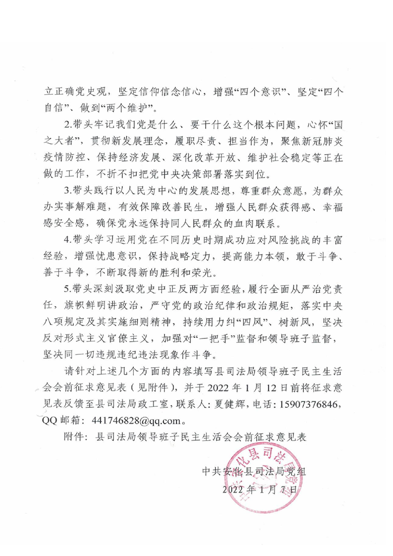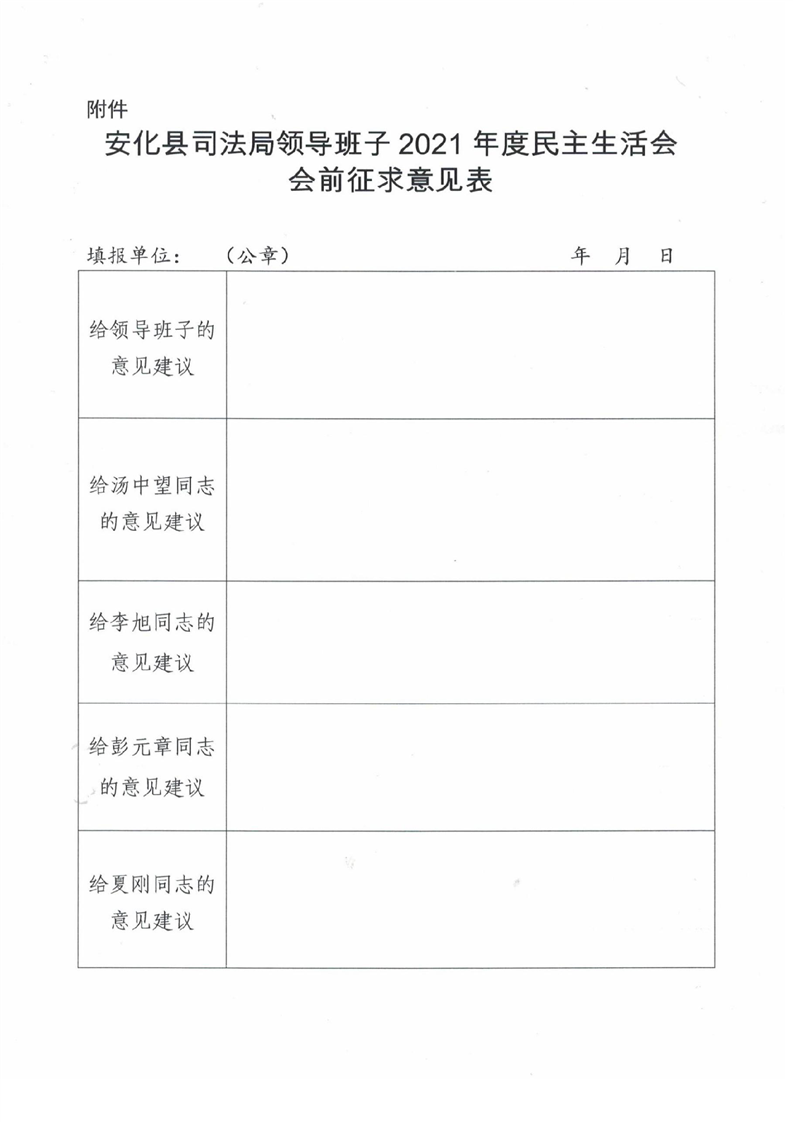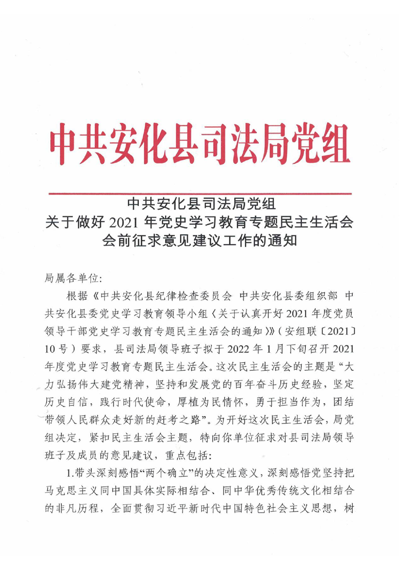 中共安化县司法局党组关于做好2021年党史学习教育专题民主生活会会前征求意见建议工作的通知