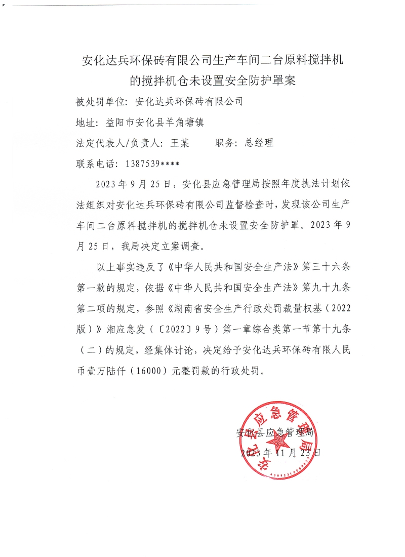 安化达兵环保砖有限公司生产车间二台原料搅拌机的搅拌机仓未设置安全防护罩案