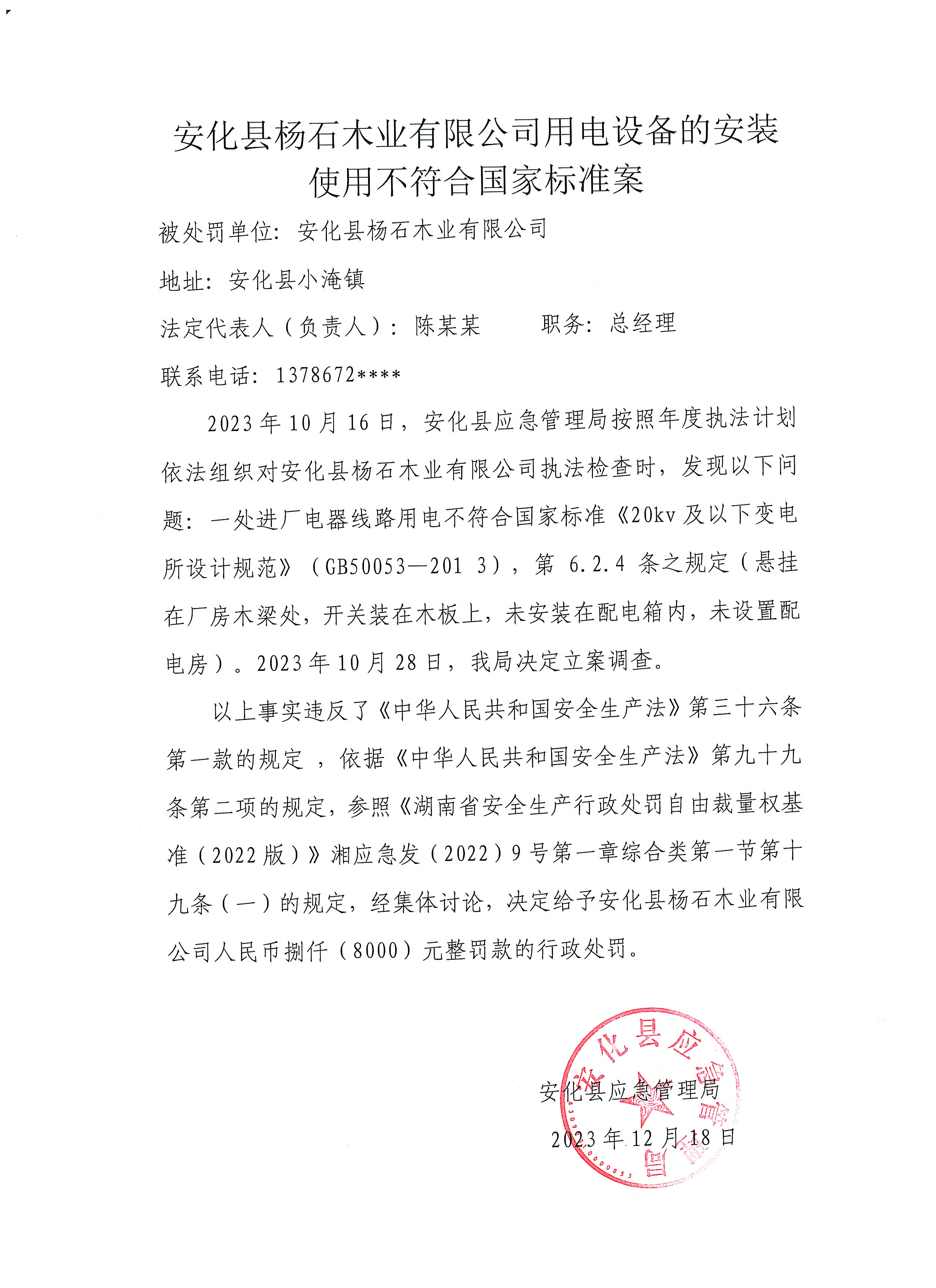 安化县杨石木业有限公司用电设备的安装使用不符合国家标准案