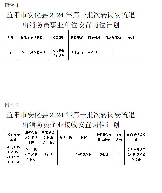 附件:1.益阳市安化县2024年第一批次转岗安置退出消防员事业单位安置岗位计划