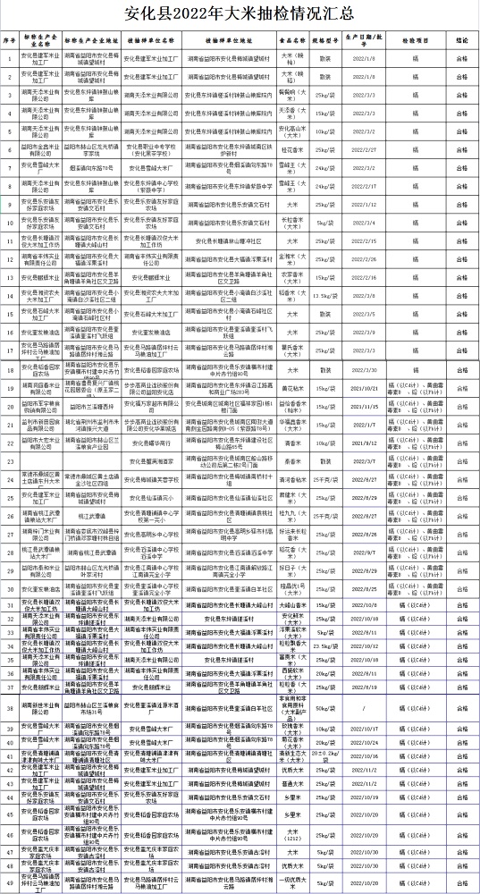 今年来,安化县已完成对16家生产加工企业、9所学校、4家超市总计49批次大米抽检,检测结果合格率100%。