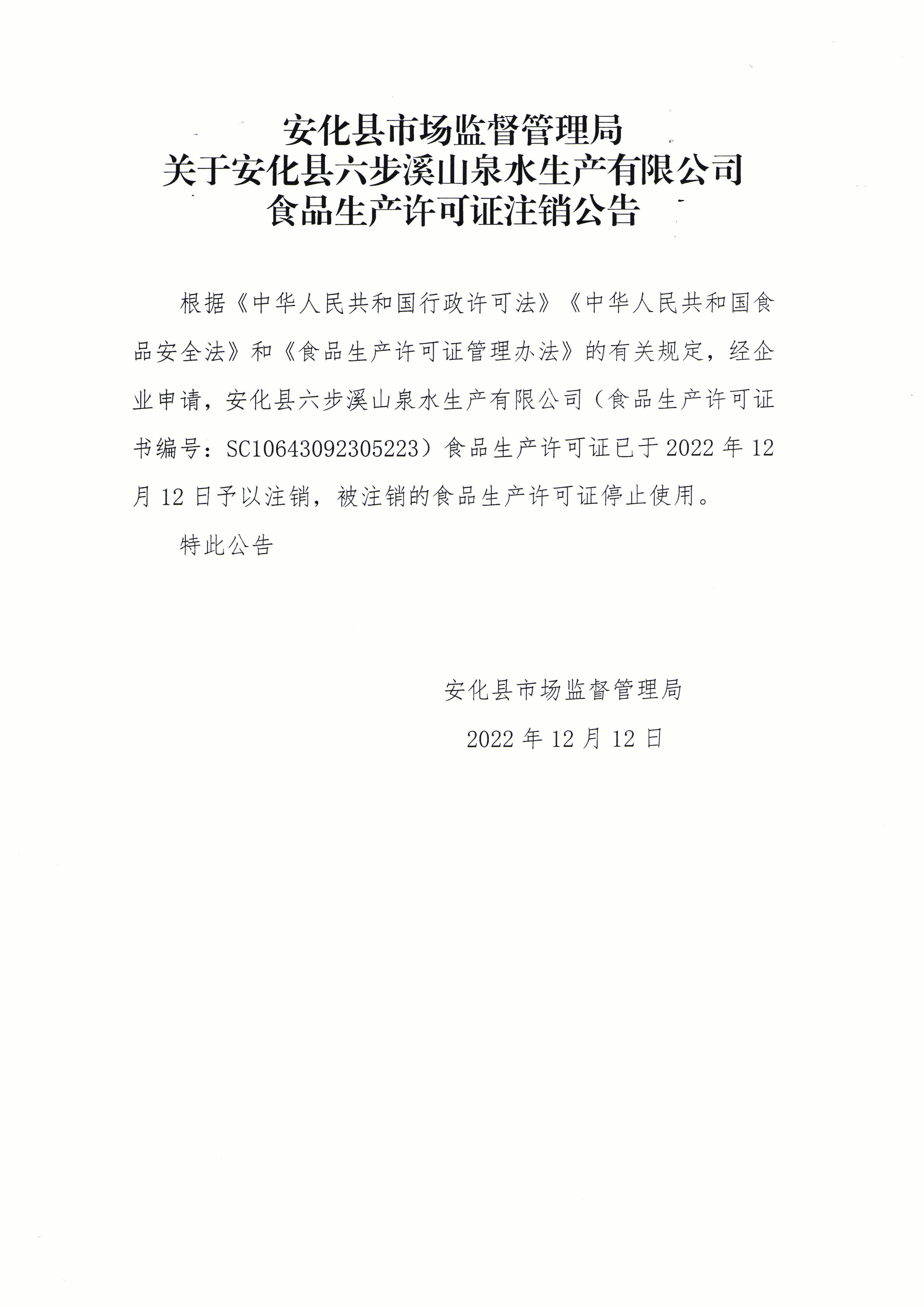 关于安化县六步溪山泉水生产有限公司食品生产许可证注销的公告