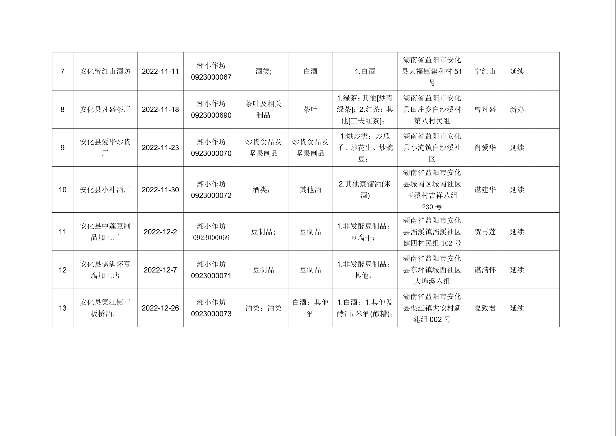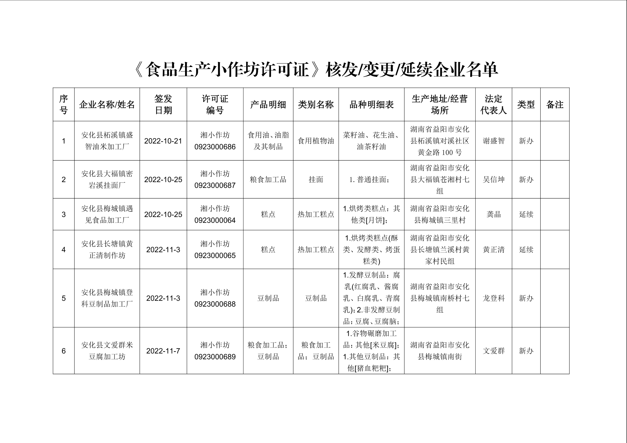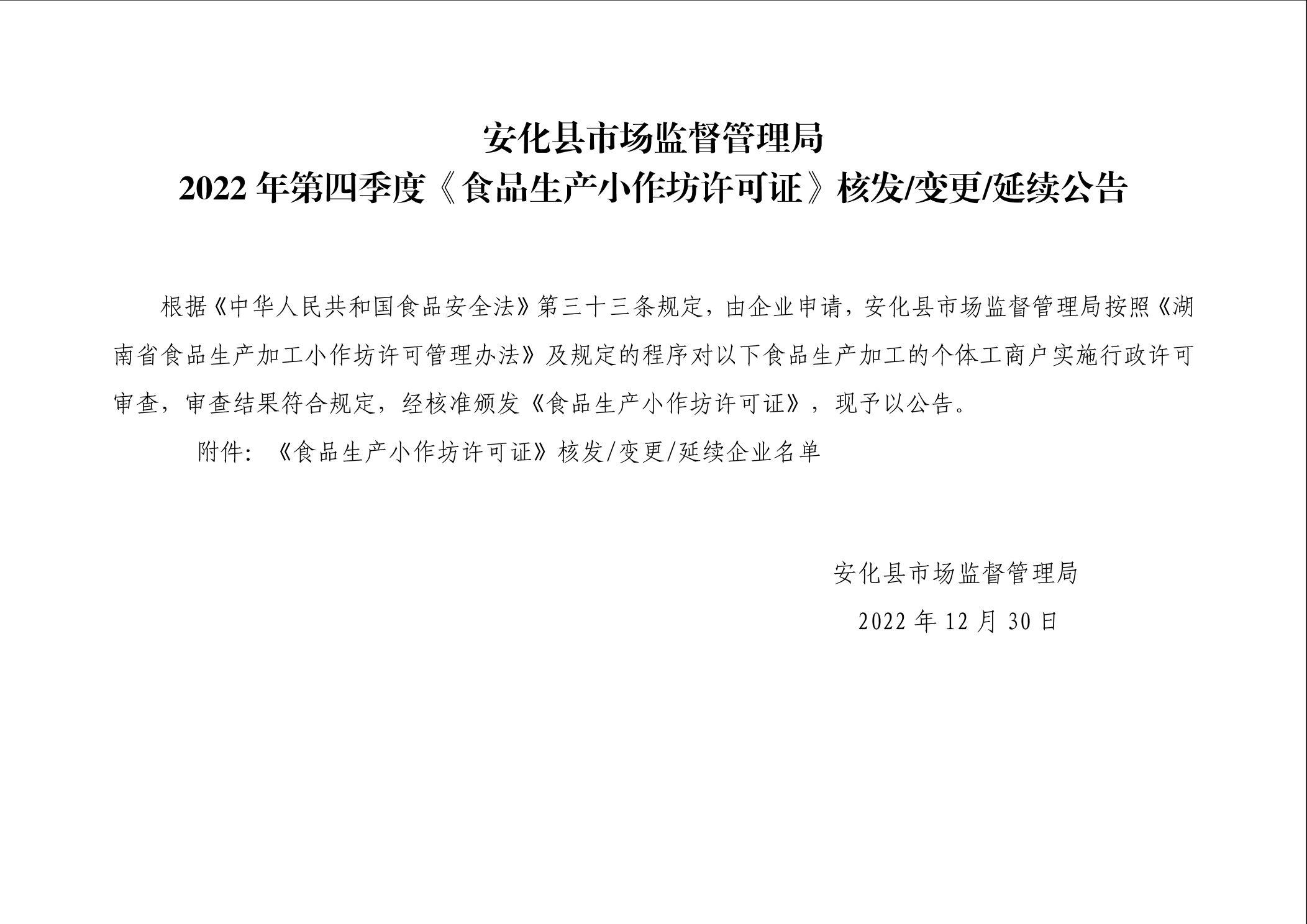 安化县市场监督管理局2022年第四季度《食品生产小作坊许可证》核发/变更/延续公告