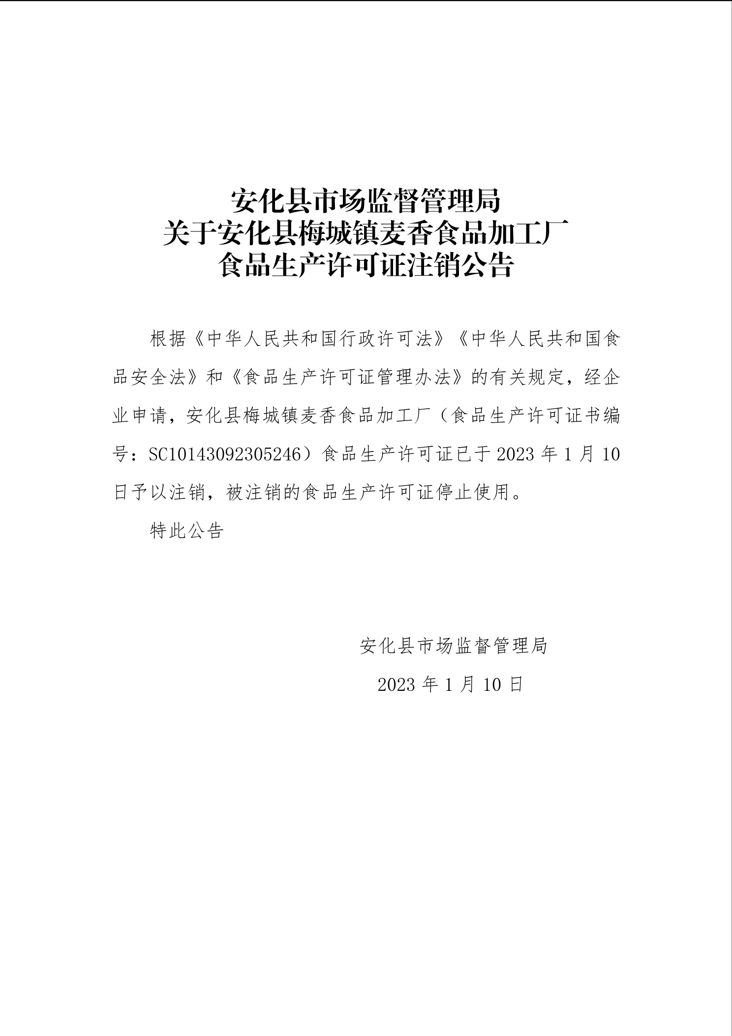 关于安化县梅城镇麦香食品加工厂食品生产许可证注销的公告