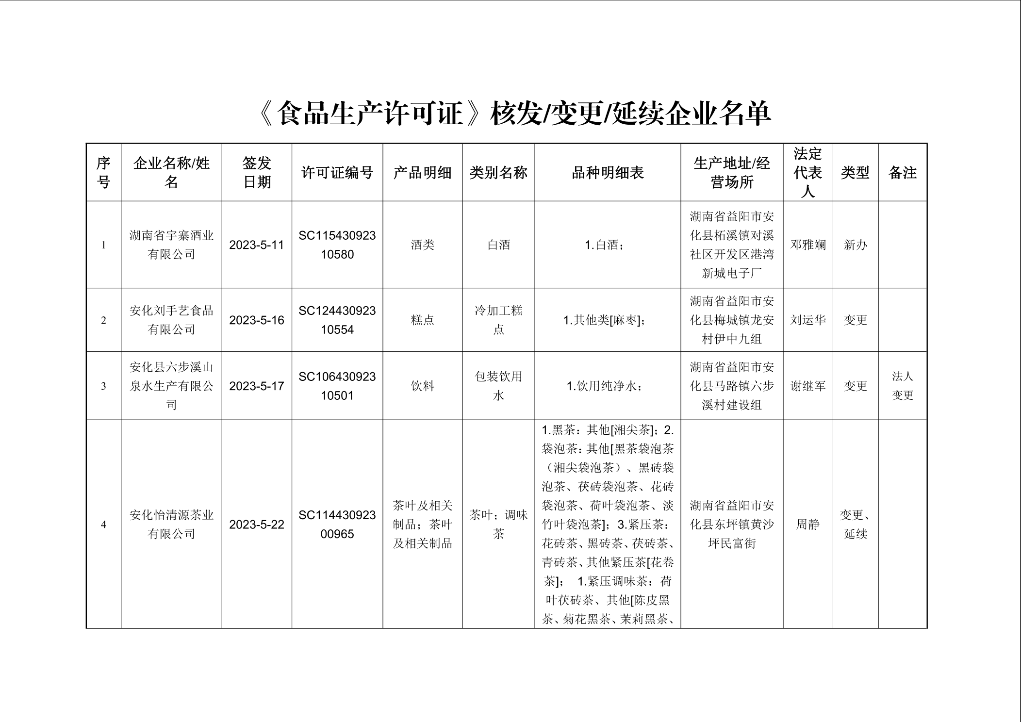 安化县市场监督管理局2023年第5期《食品生产许可证》核发/变更/延续公告
