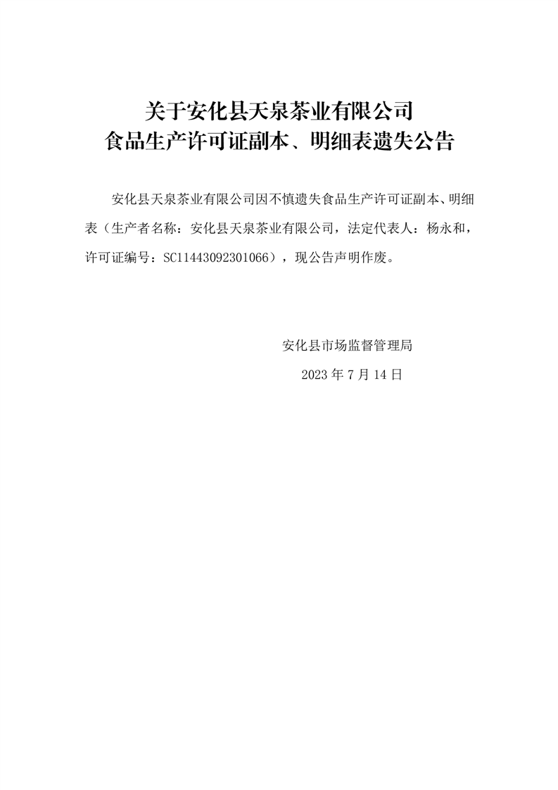 关于安化县天泉茶业有限公司食品生产许可证副本、明细表遗失公告