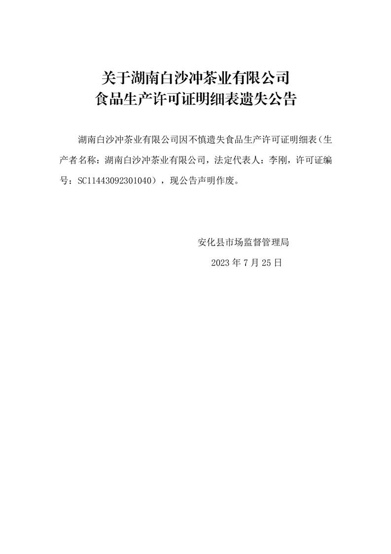关于湖南白沙冲茶业有限公司食品生产许可证明细表遗失公告