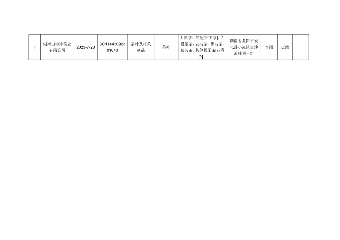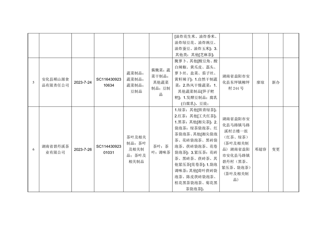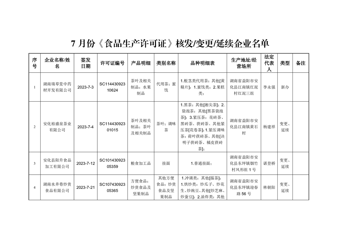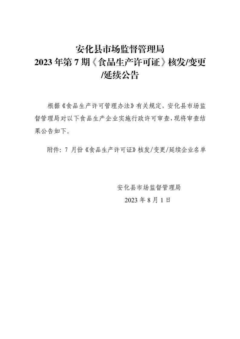 安化县市场监督管理局 2023年第7期《食品生产许可证》核发/变更/延续公告