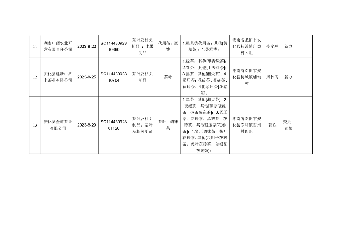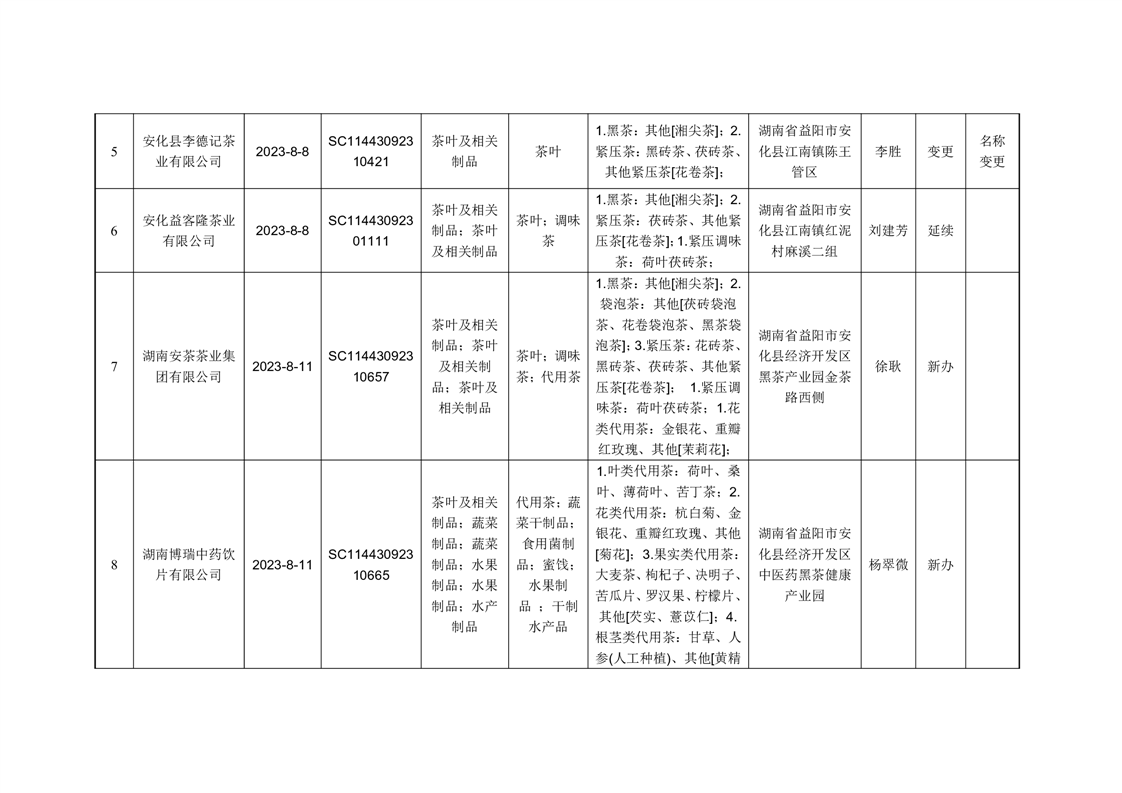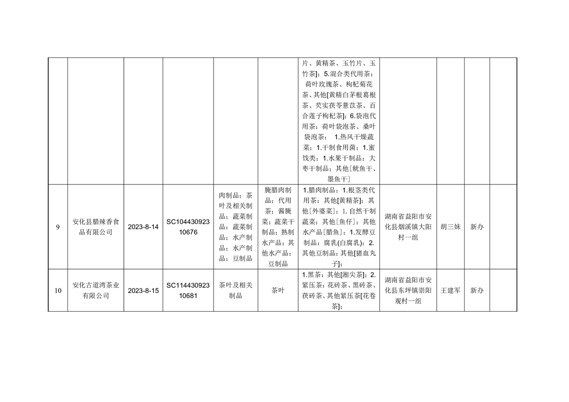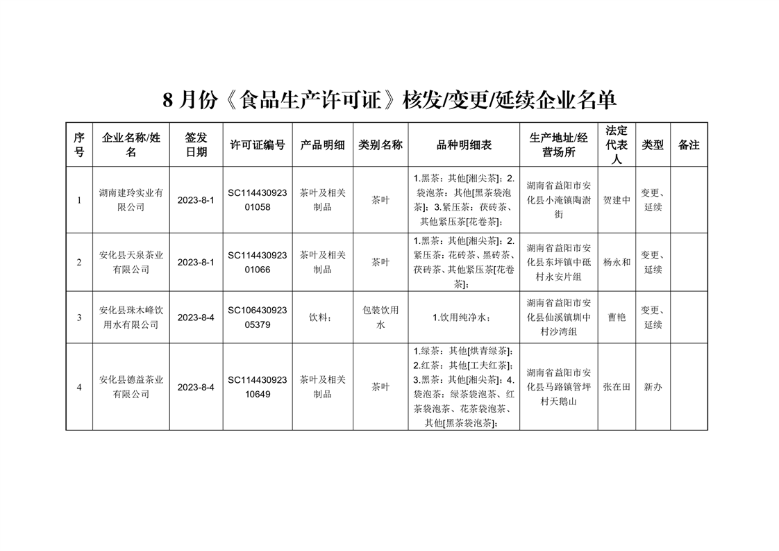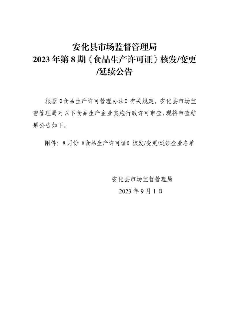 安化县市场监督管理局2023年第8期《食品生产许可证》核发/变更/延续公告