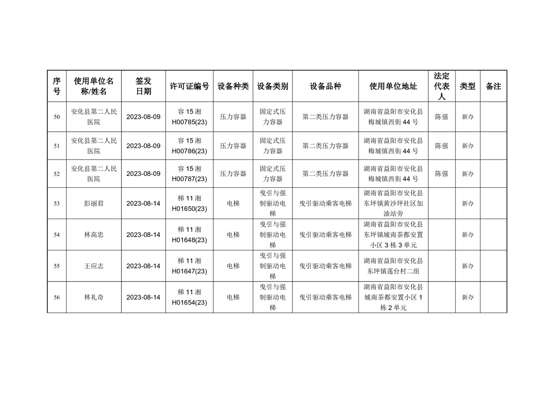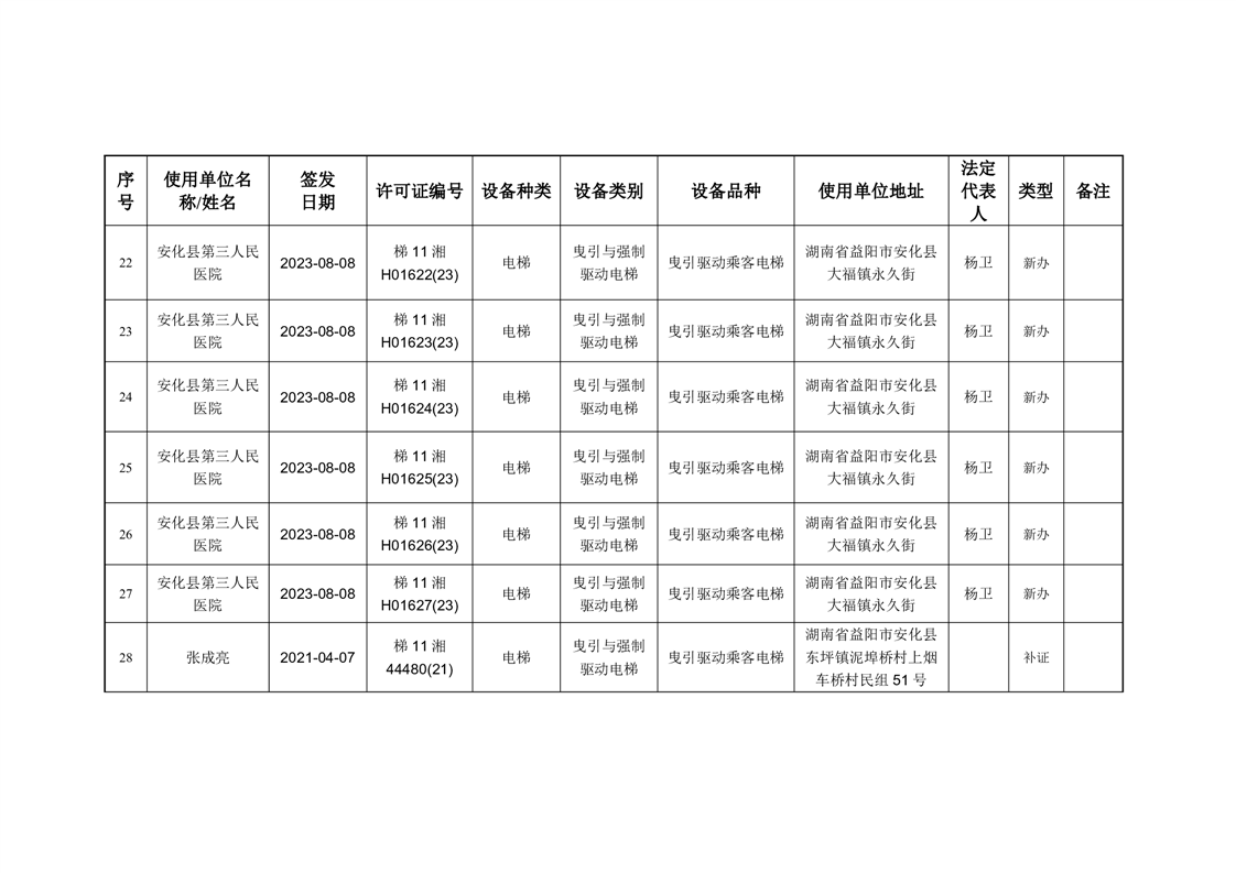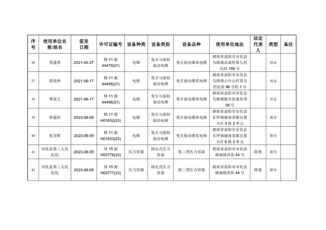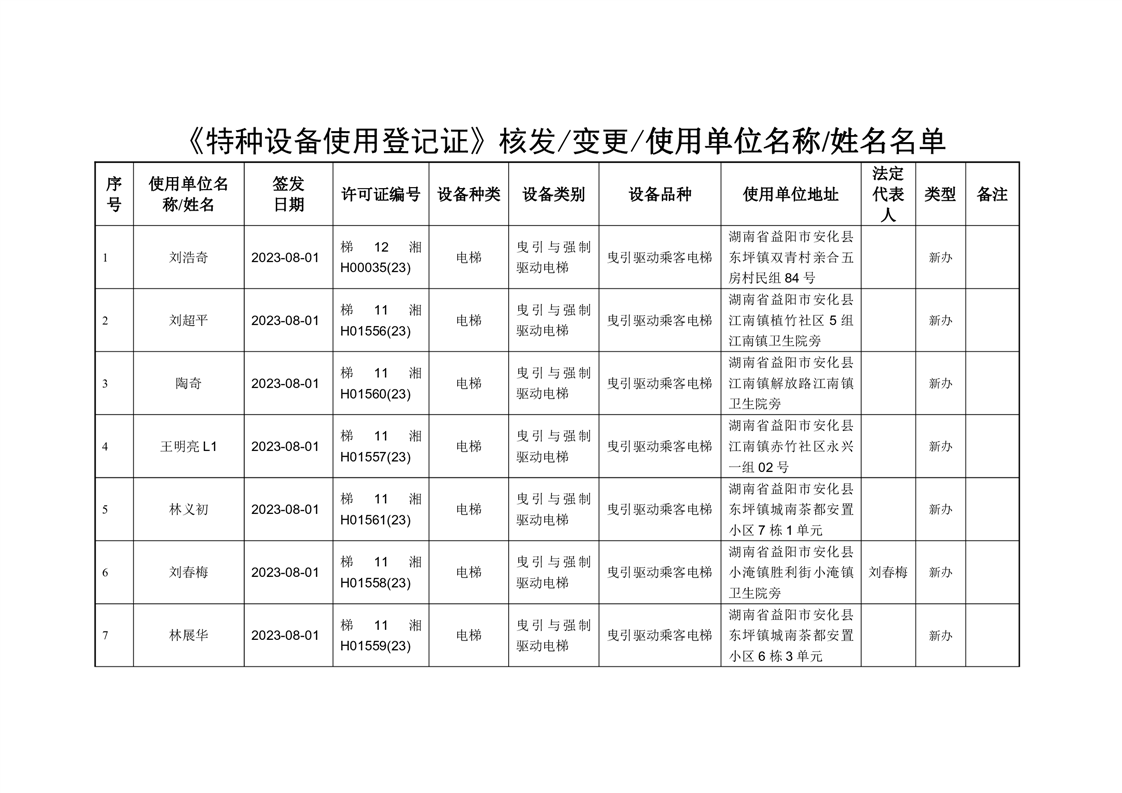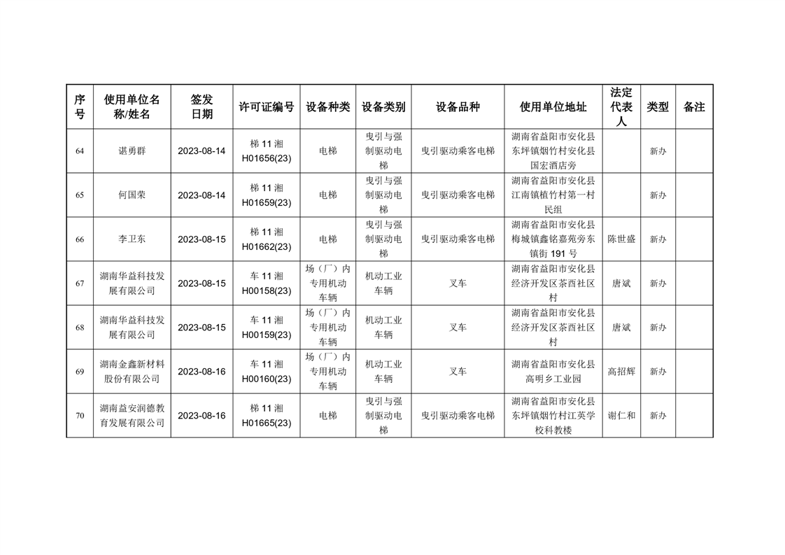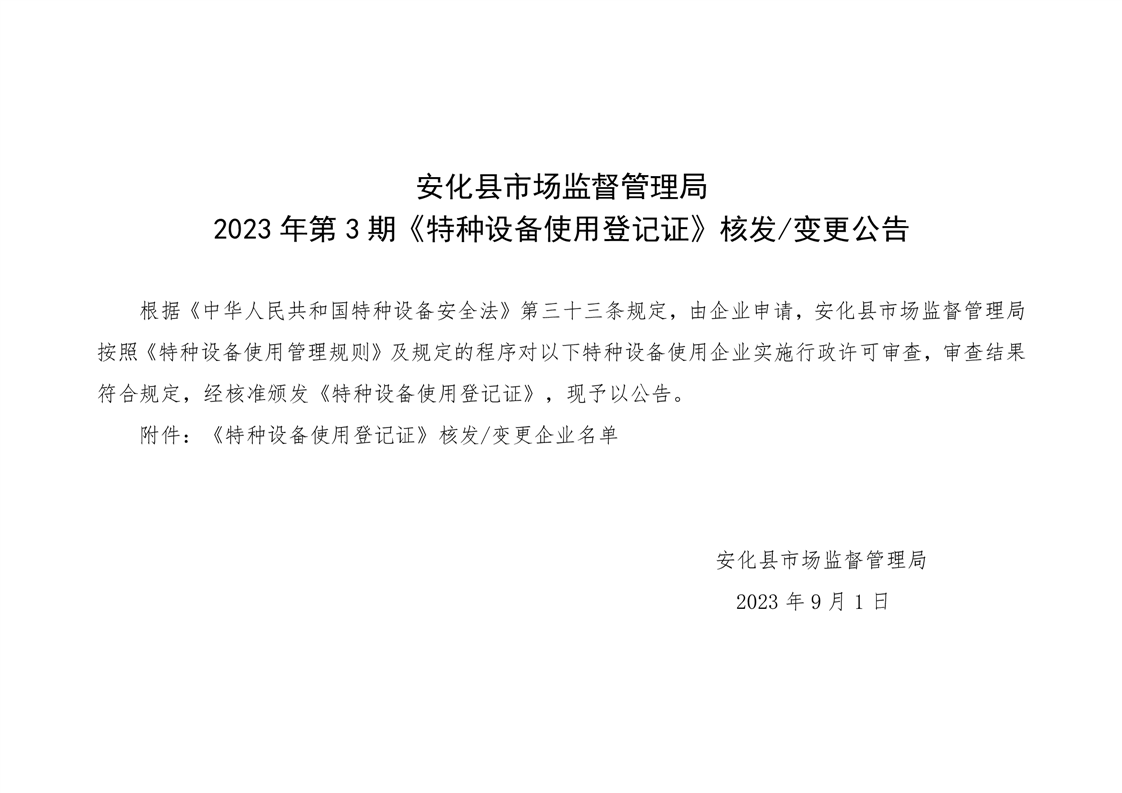 安化县市场监督管理局 2023年第3期《特种设备使用登记证》核发/变更公告