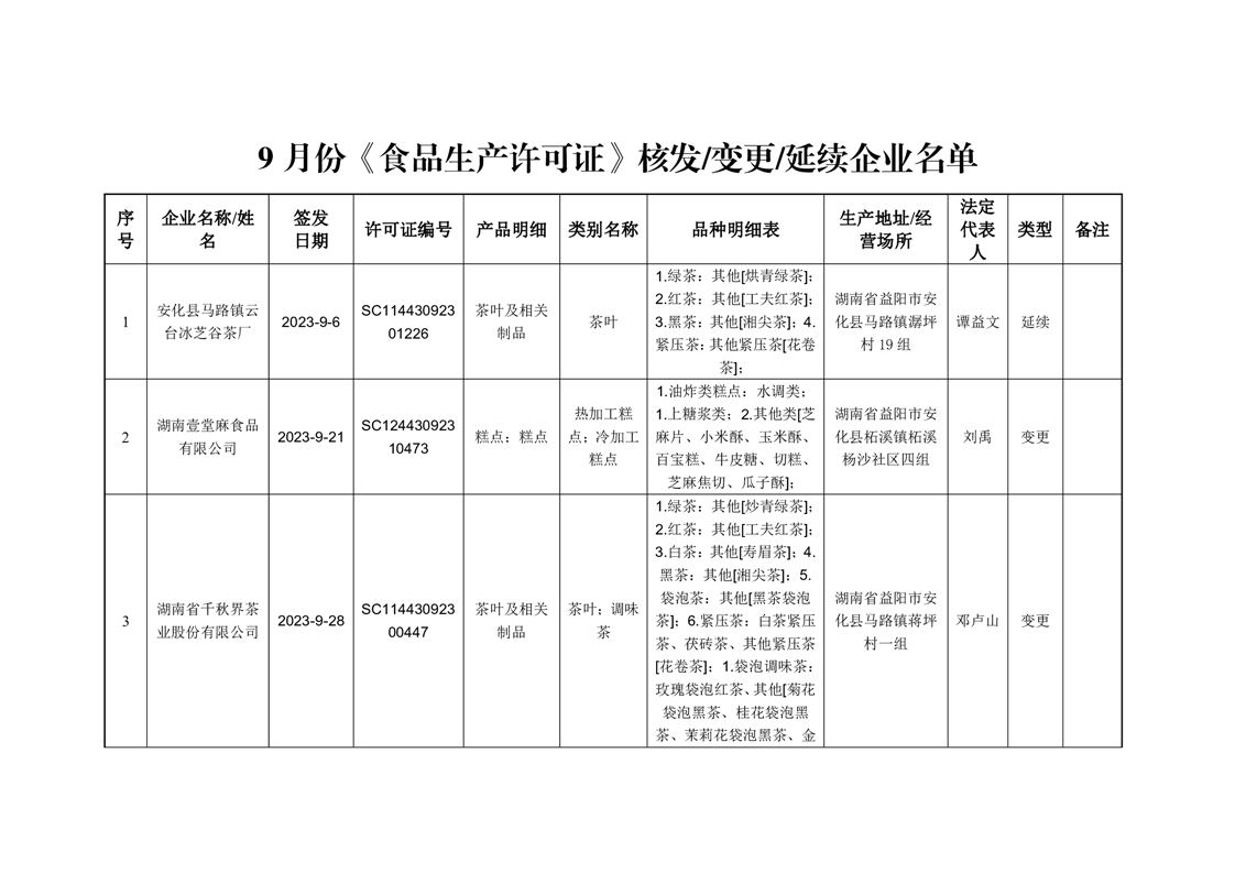 安化县市场监督管理局2023年第9期《食品生产许可证》核发/变更/延续公告