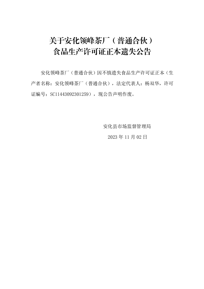 关于安化领峰茶厂(普通合伙)食品生产许可证正本遗失公告