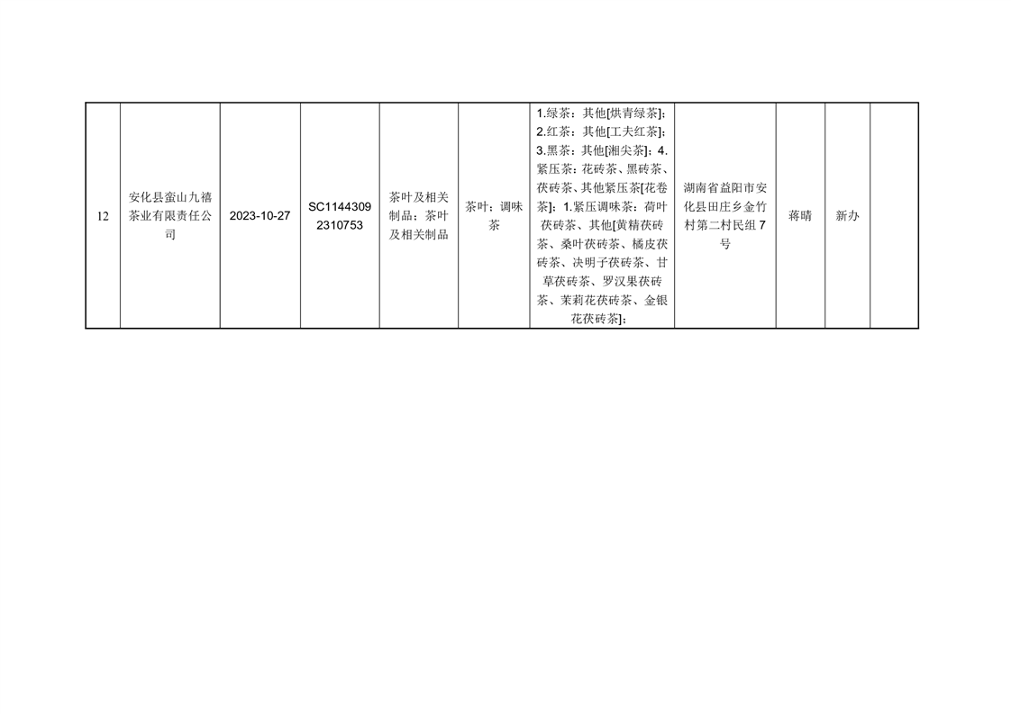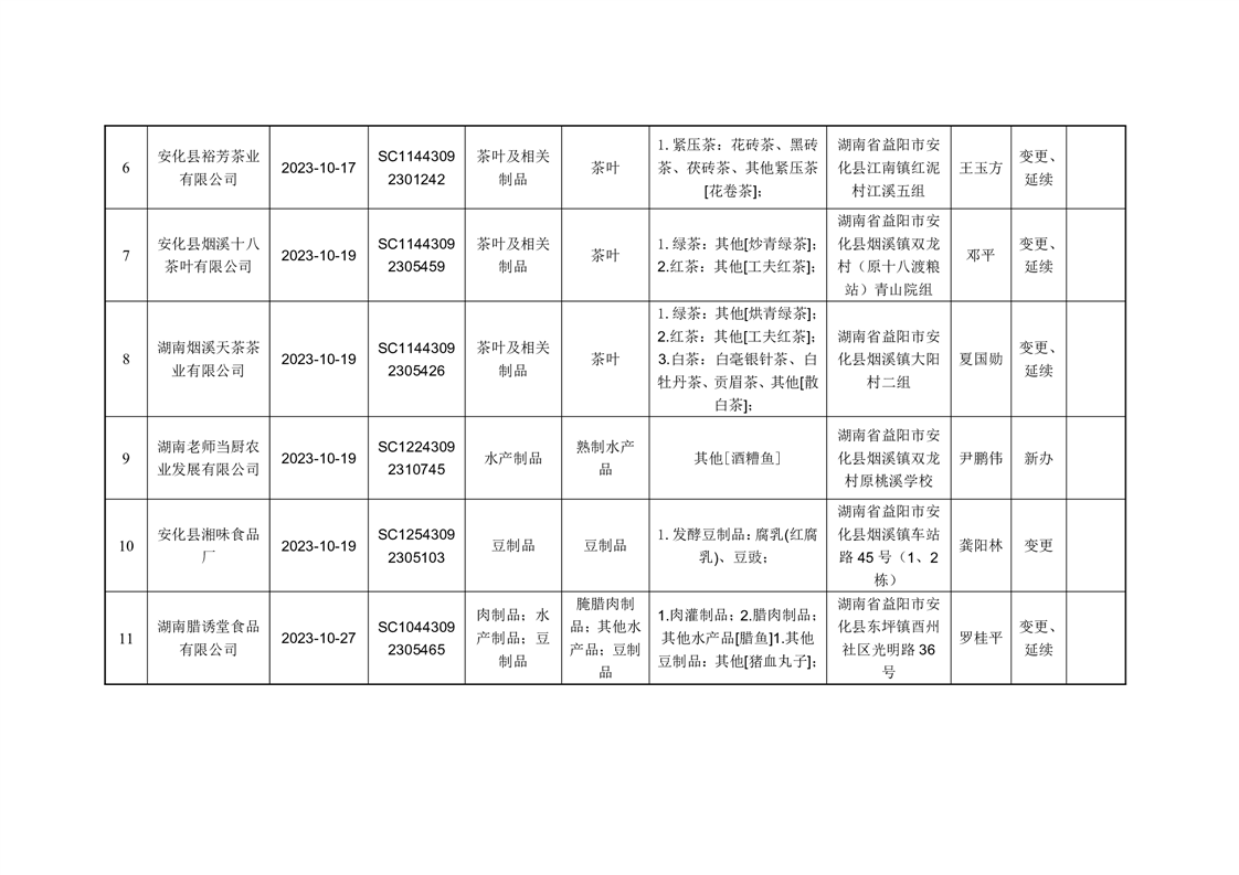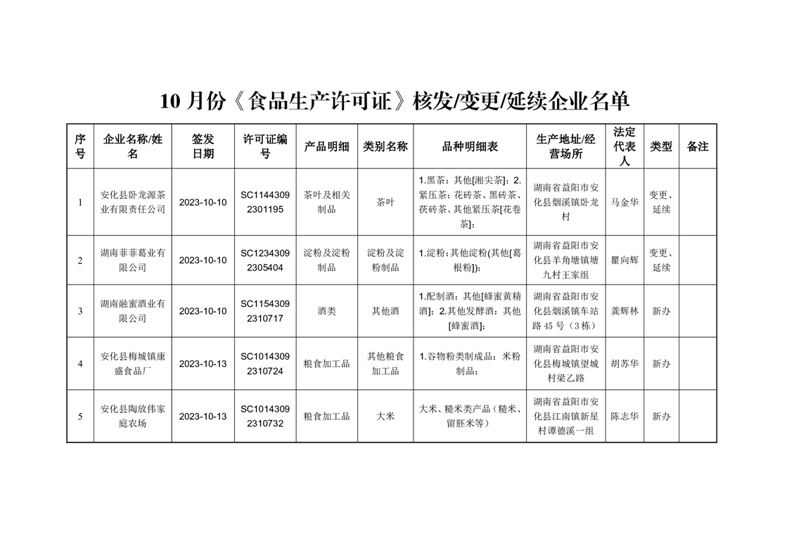 安化县市场监督管理局2023年第10期《食品生产许可证》核发/变更/延续公告