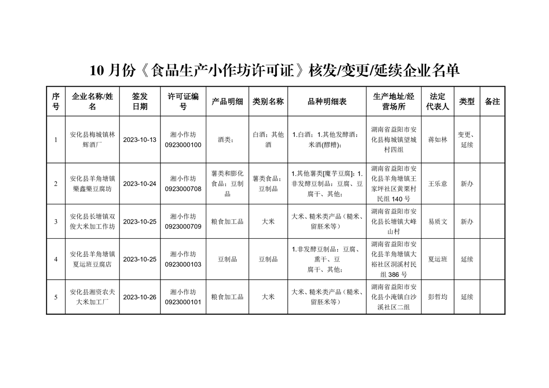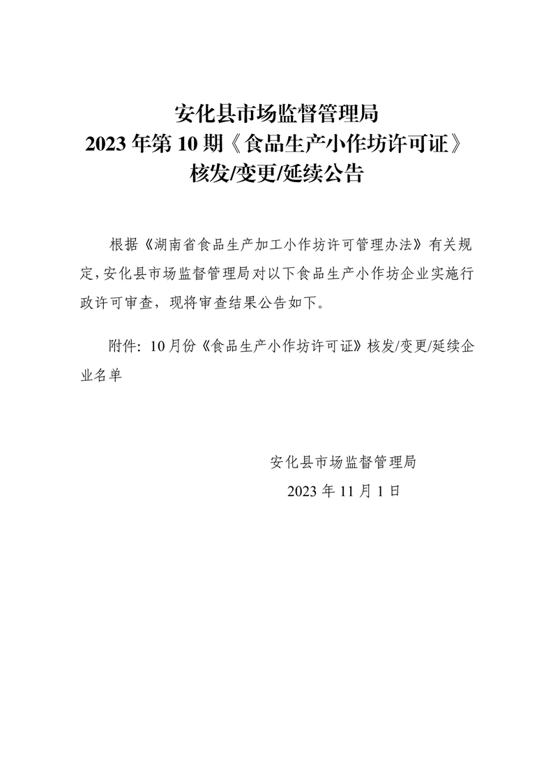 安化县市场监督管理局2023年第10期《食品生产小作坊许可证》 核发/变更/延续公告