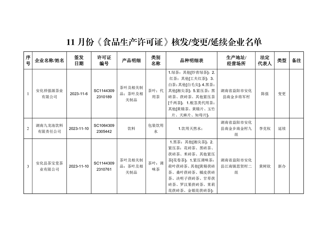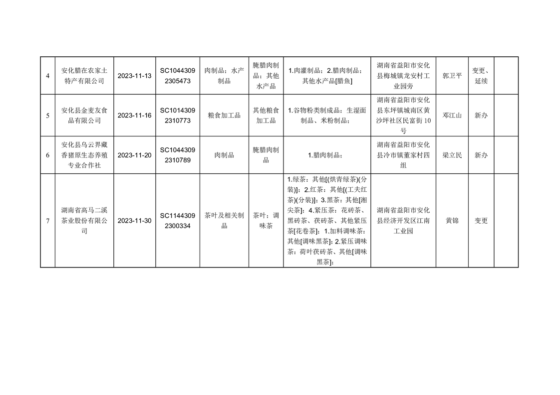 安化县市场监督管理局2023年第11期《食品生产许可证》核发/变更/延续公告