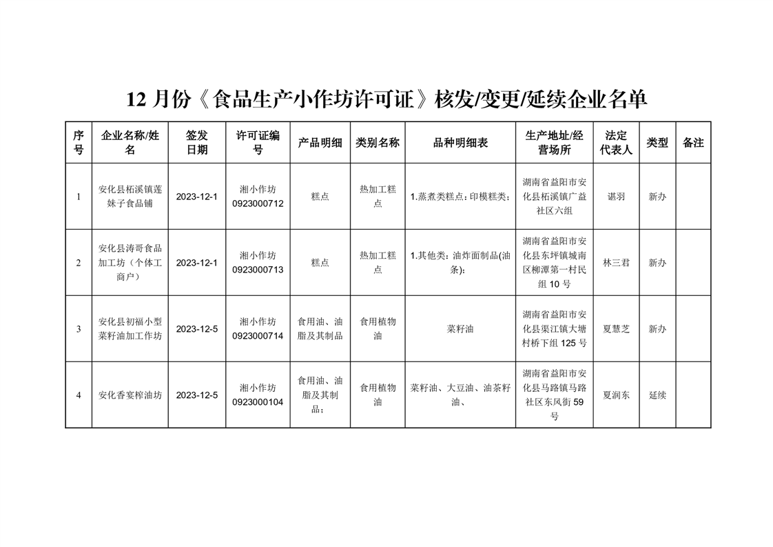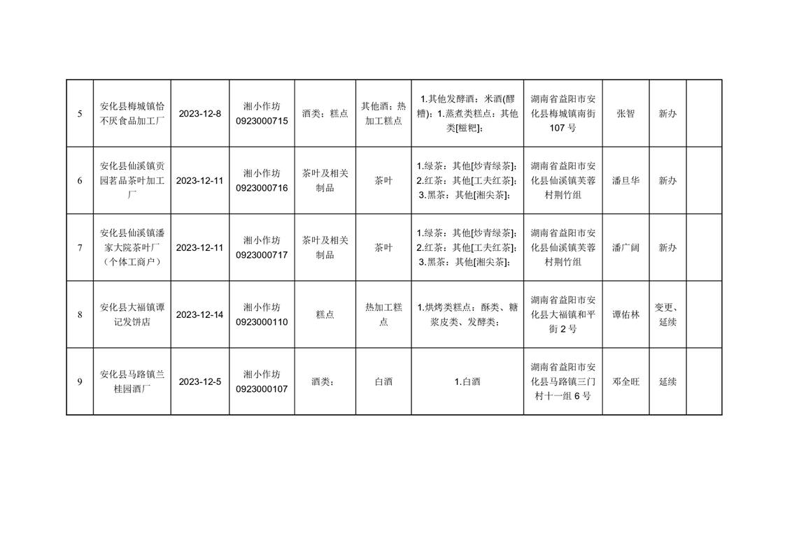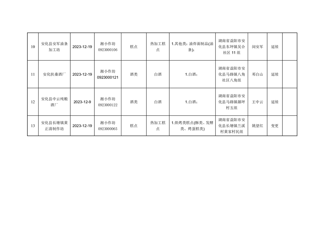 安化县市场监督管理局2023年第12期《食品生产小作坊许可证》 核发/变更/延续公告