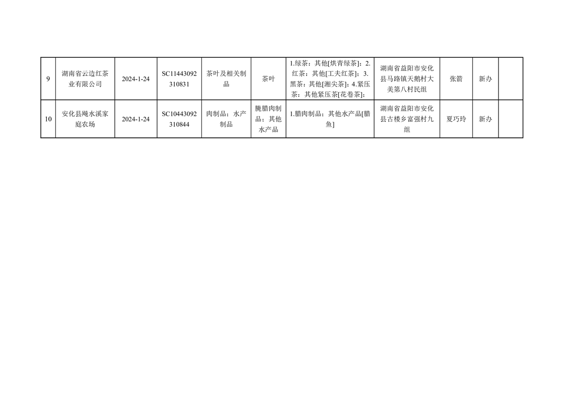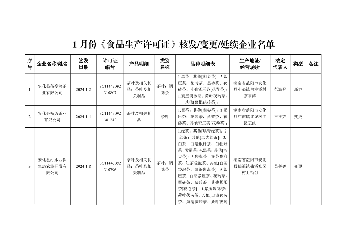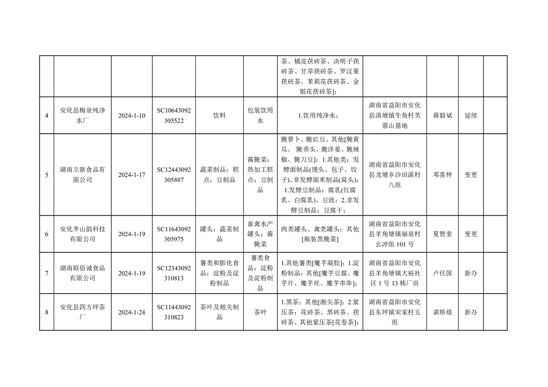 安化县市场监督管理局2024年第1期《食品生产许可证》核发/变更/延续公告