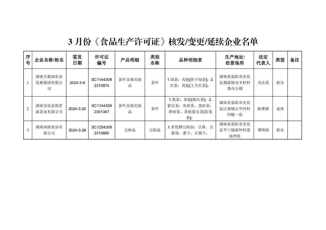 安化县市场监督管理局2024年第3期《食品生产许可证》核发/变更/延续公告