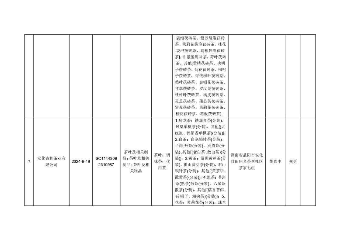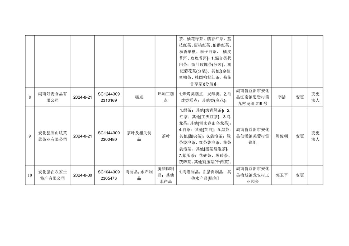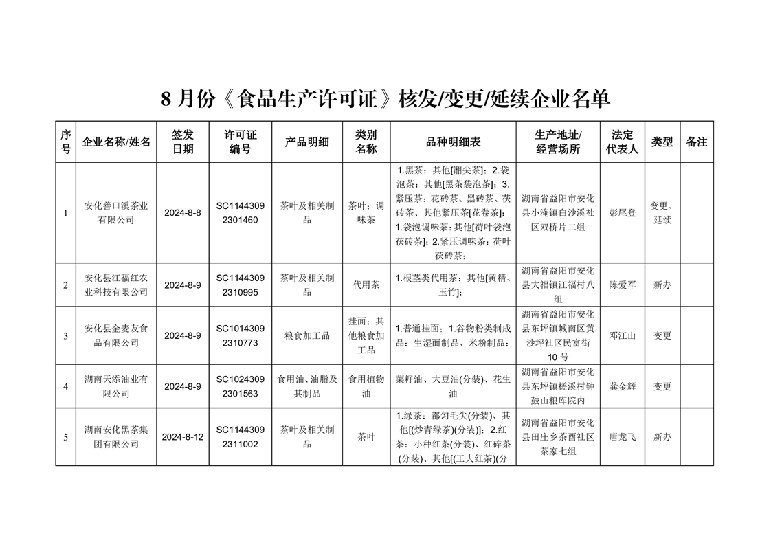 安化县市场监督管理局 2024年第8期《食品生产许可证》核发/变更/延续公告