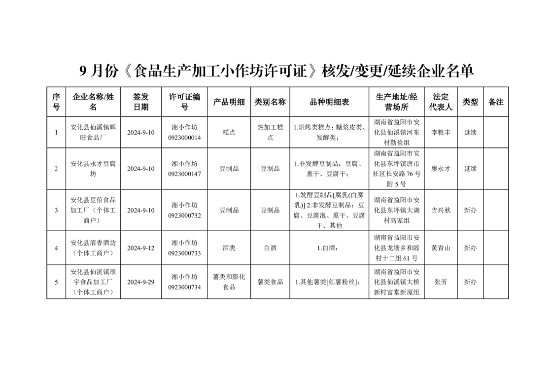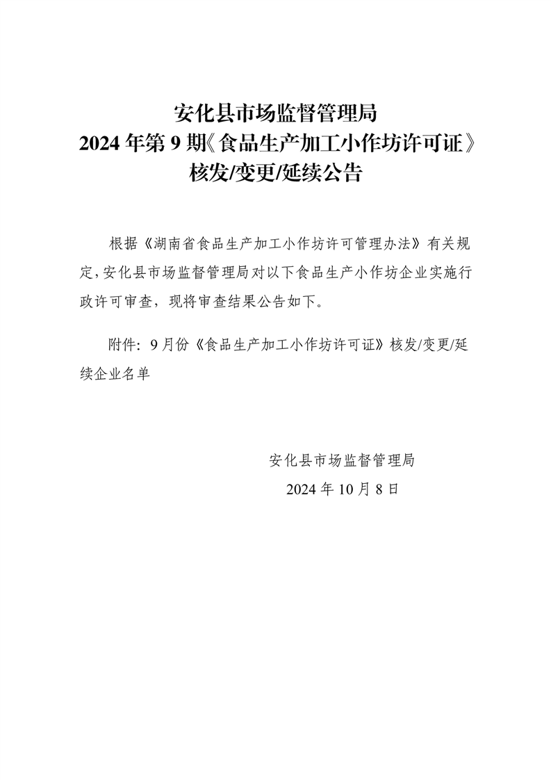 安化县市场监督管理局 2024年第9期《食品生产加工小作坊许可证》核发/变更/延续公告