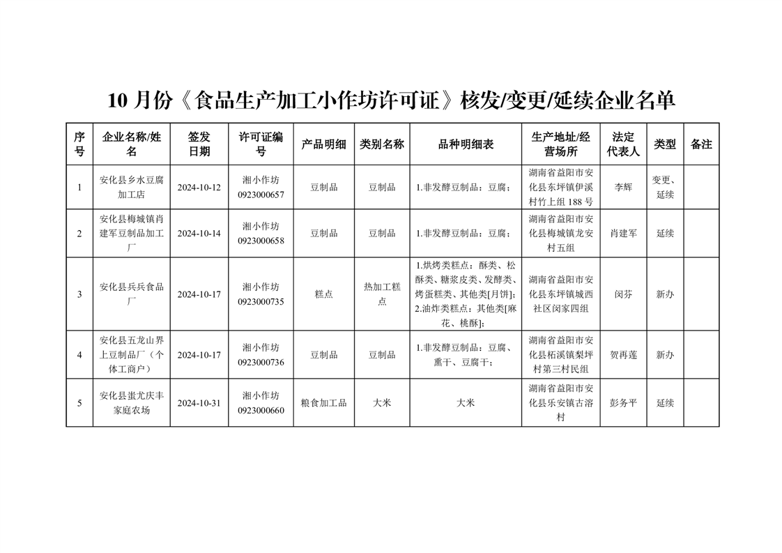 安化县市场监督管理局 2024年第10期《食品生产加工小作坊许可证》核发/变更/延续公告