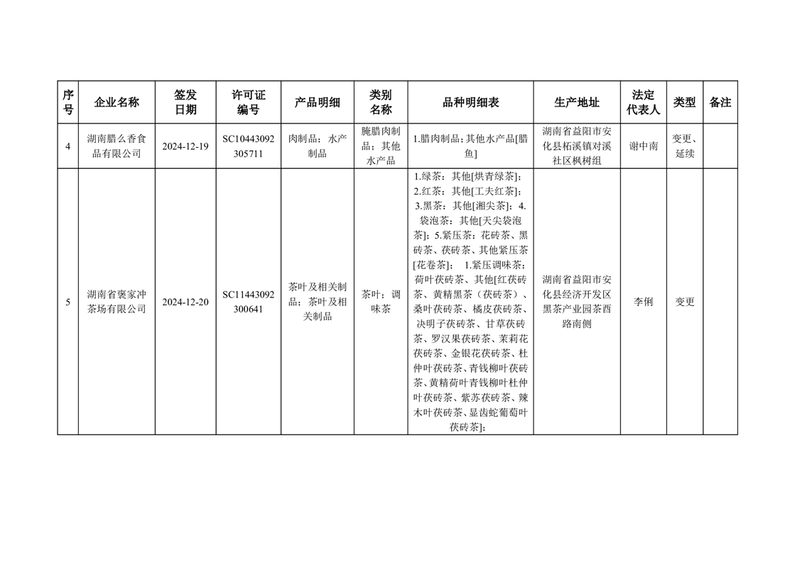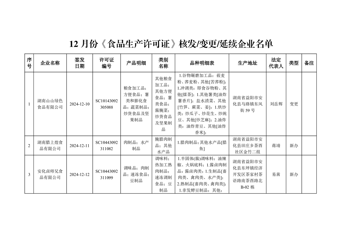 安化县市场监督管理局 2024年第12期《食品生产许可证》核发/变更/延续公告