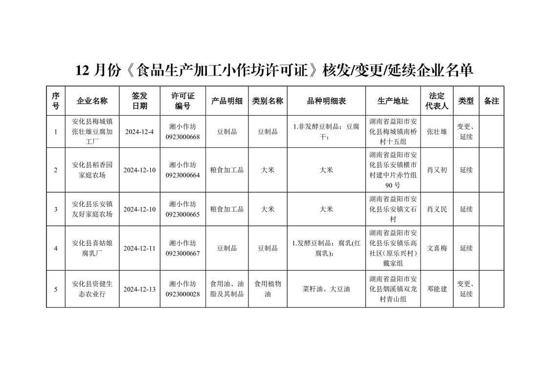 安化县市场监督管理局 2024年第12期《食品生产加工小作坊许可证》核发/变更/延续公告