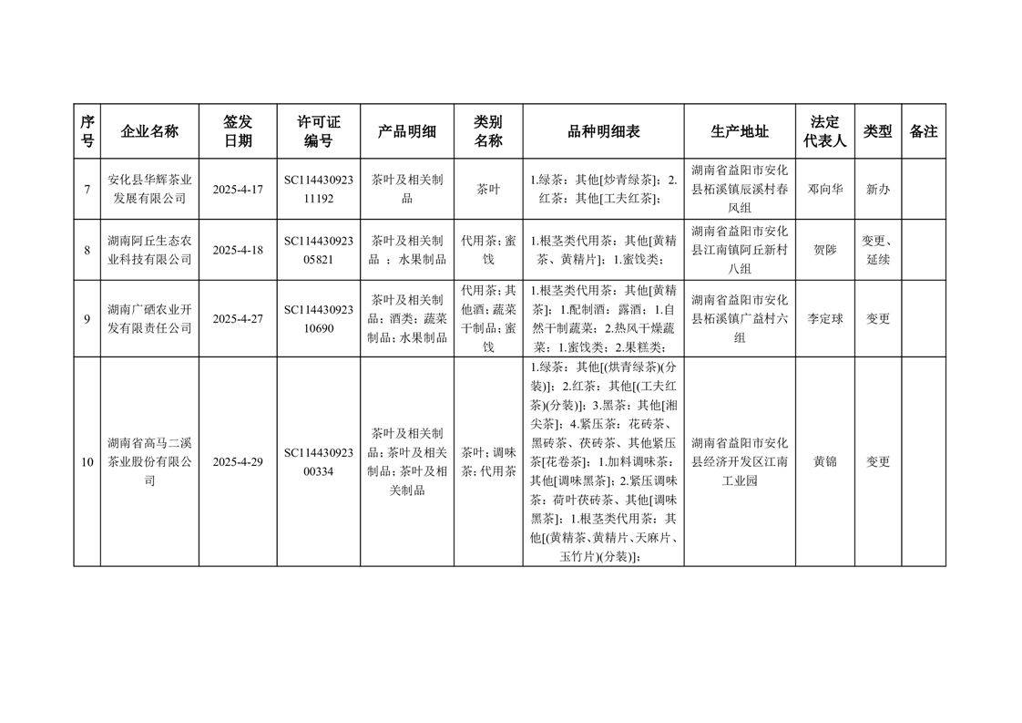 安化县市场监督管理局 2025年第4期《食品生产许可证》核发/变更/延续公告