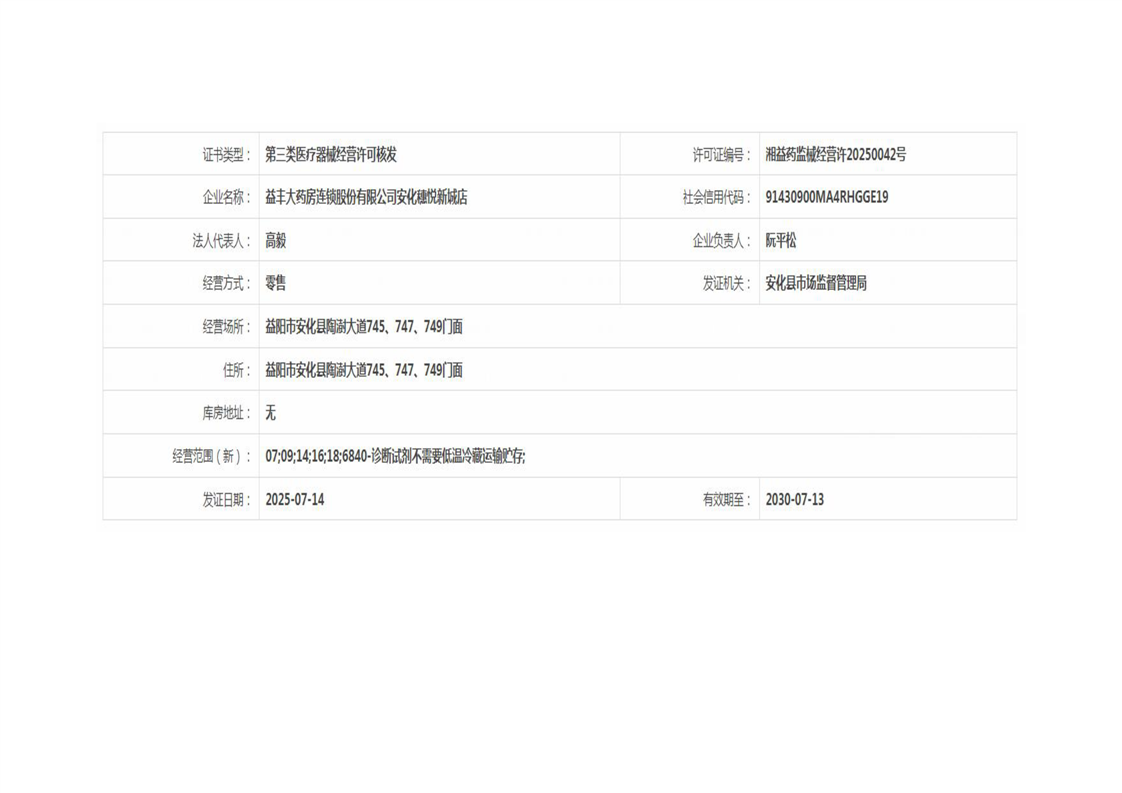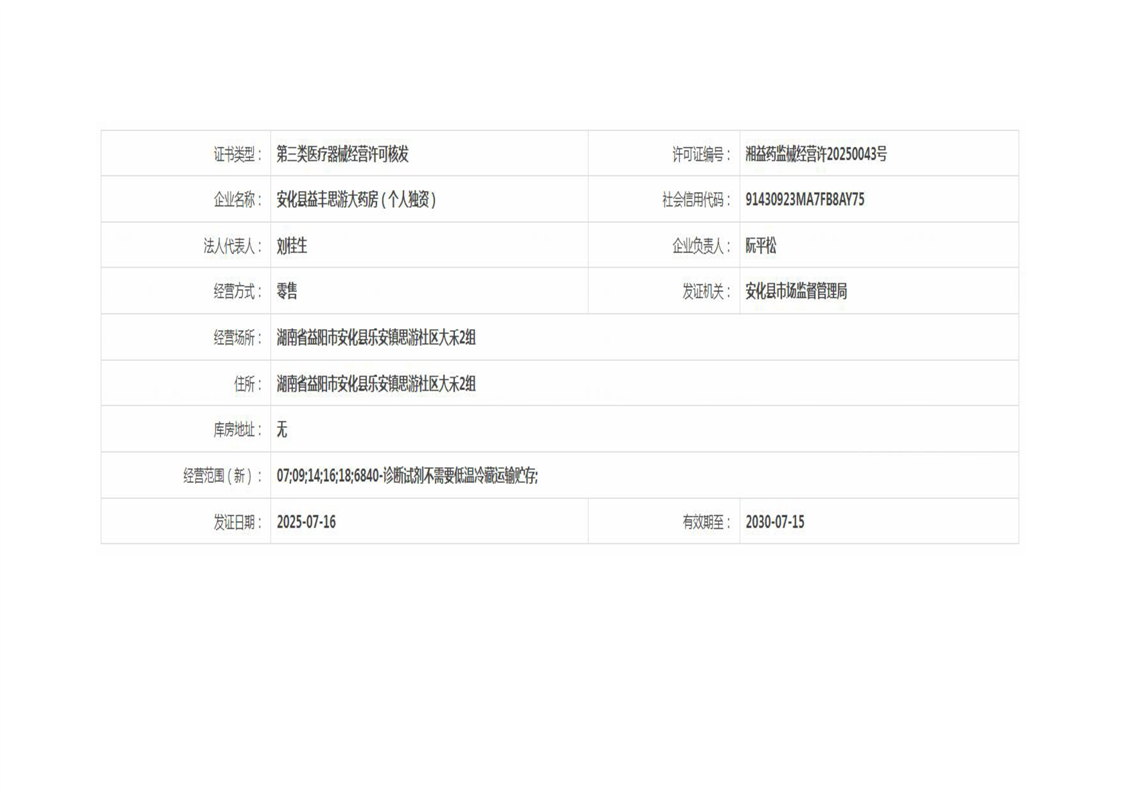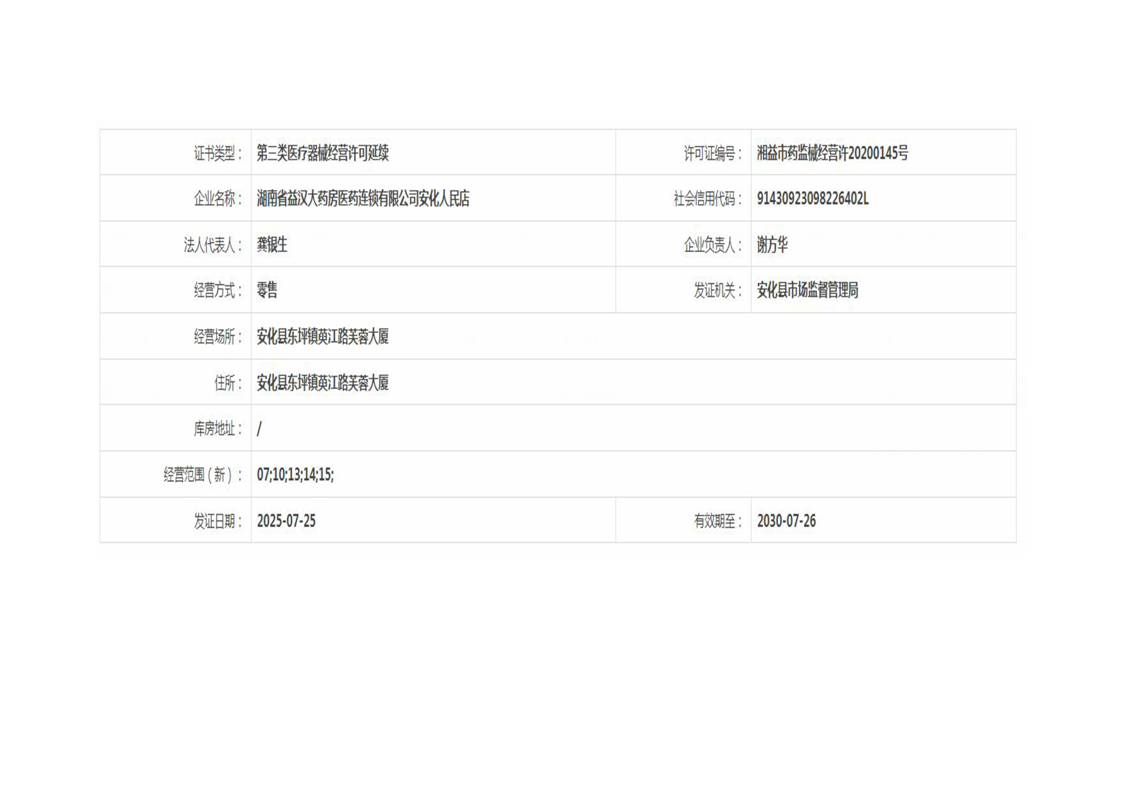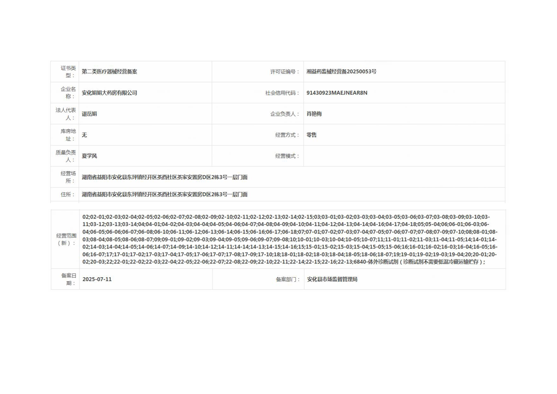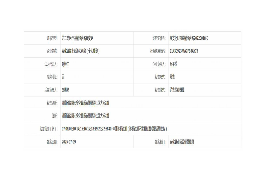 安化县市场监督管理局 医疗器械经营许可(备案)信息公示 (2025年第07号)