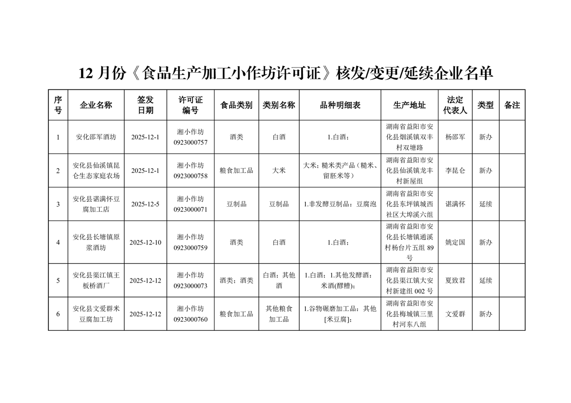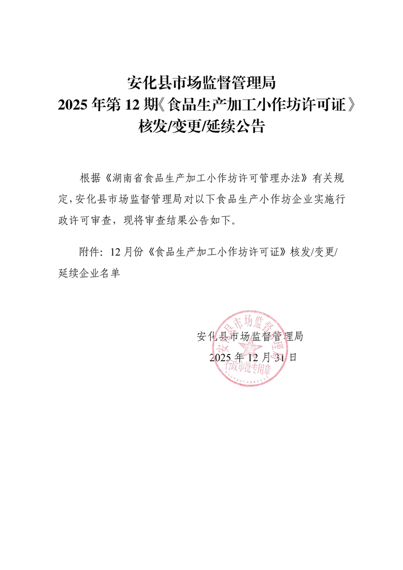 安化县市场监督管理局 2025年第12期《食品生产加工小作坊许可证》核发/变更/延续公告