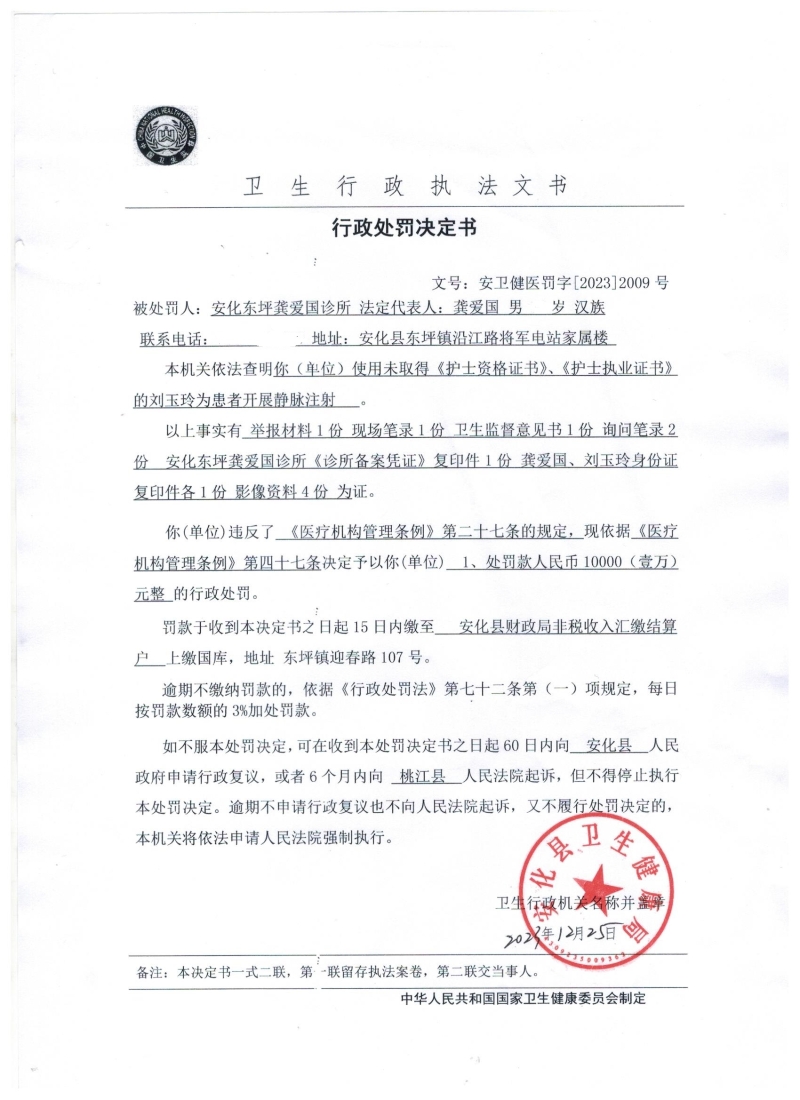 县卫生综合监督执法局行政执法公示(安化东坪龚爱国诊所)