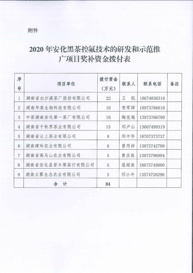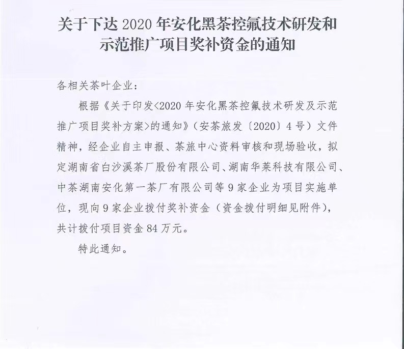 关于下达2020年安化黑茶控氟技术研发和 示范推广项目奖补资金的通知