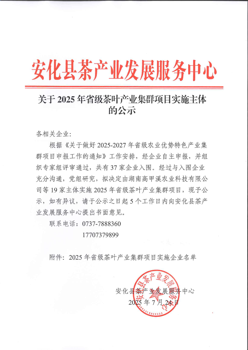关于2025年省级茶叶产业集群项目实施主体的公示