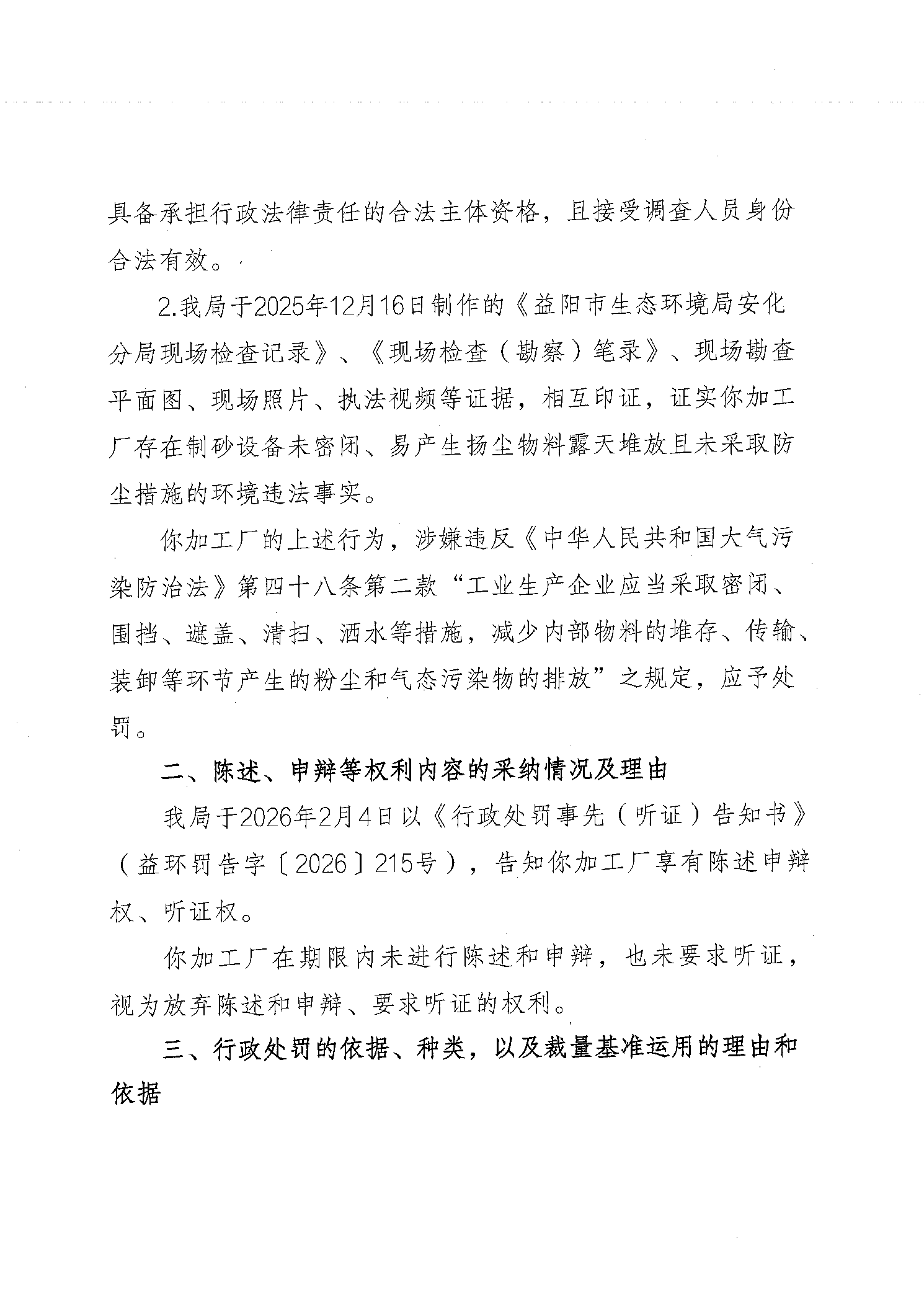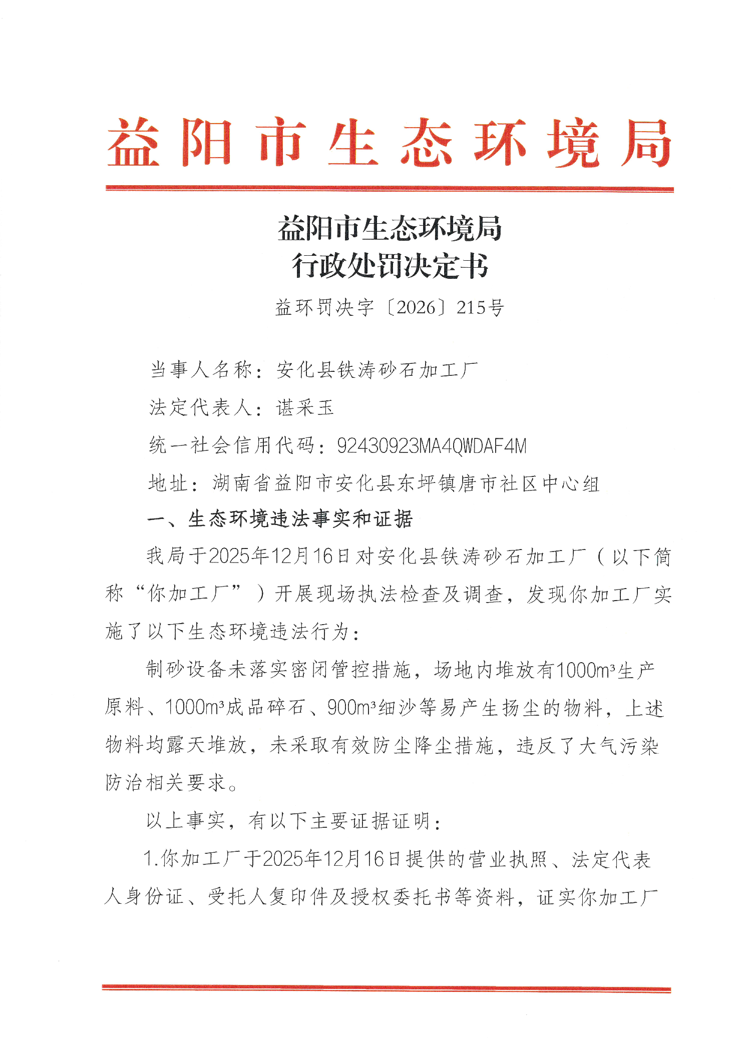 行政处罚决定书 益环罚决字〔2026〕215号 铁涛砂石