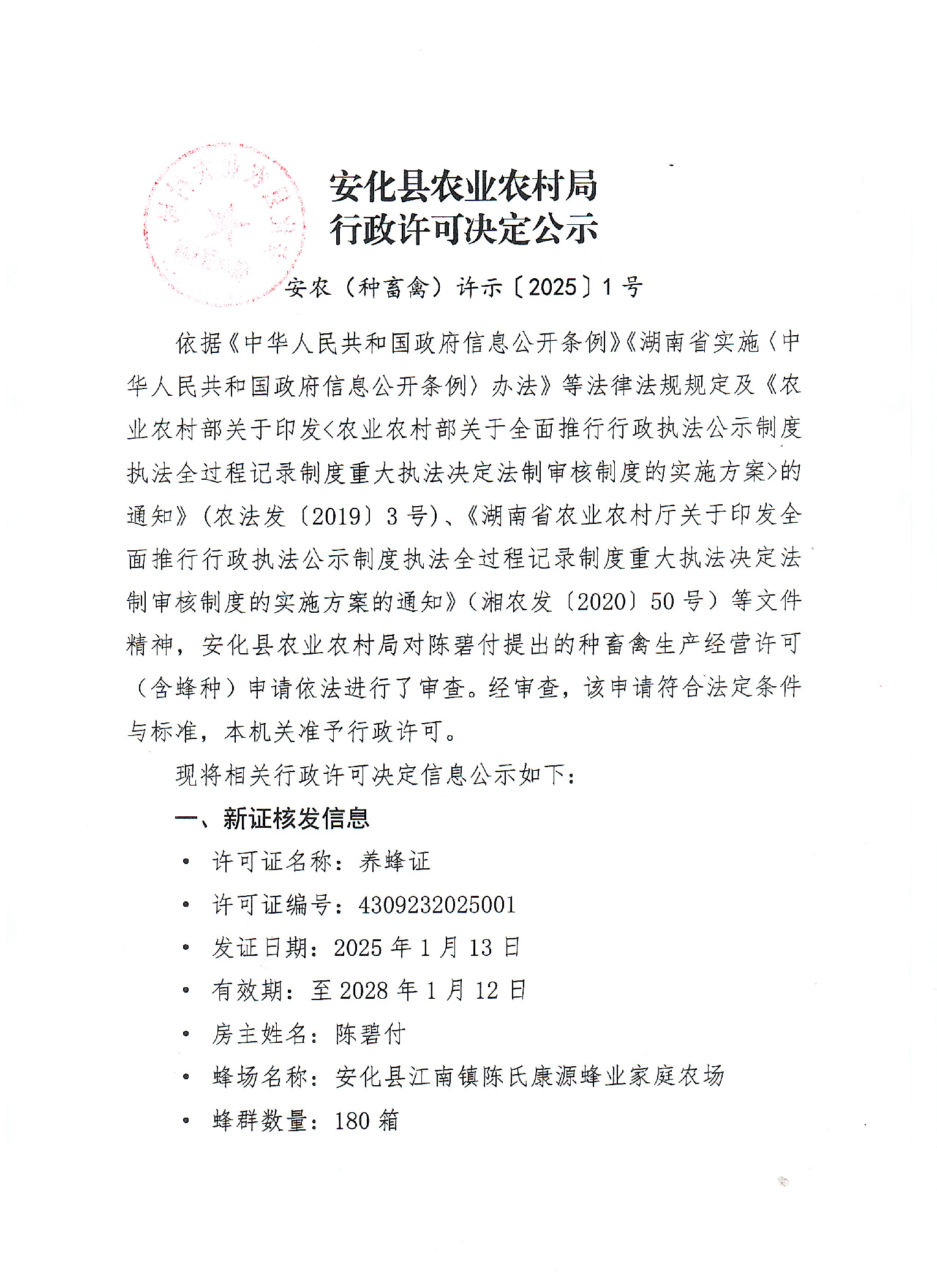 安化县农业农村局行政许可决定公示 安农(种畜禽)许示〔2025〕1号