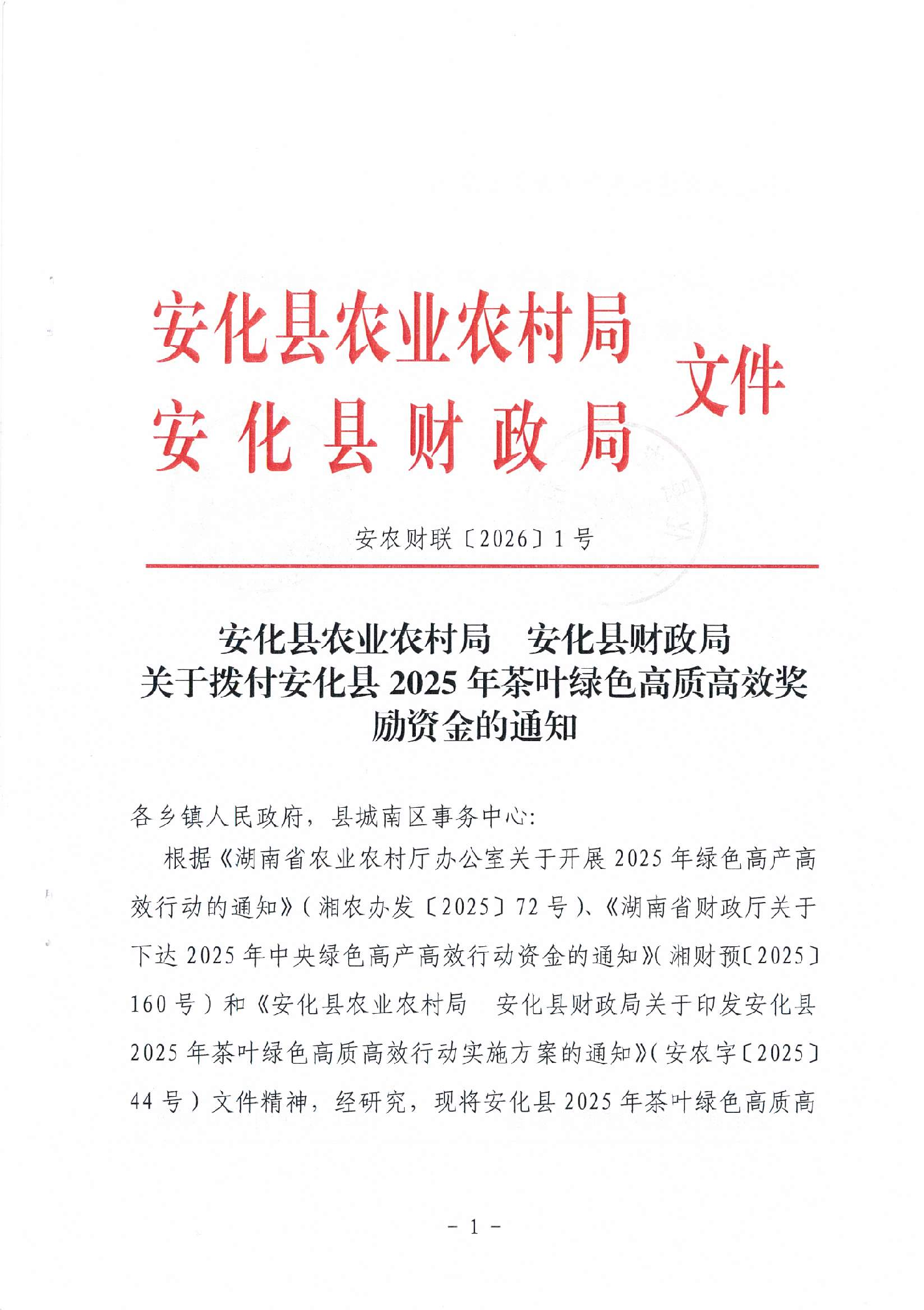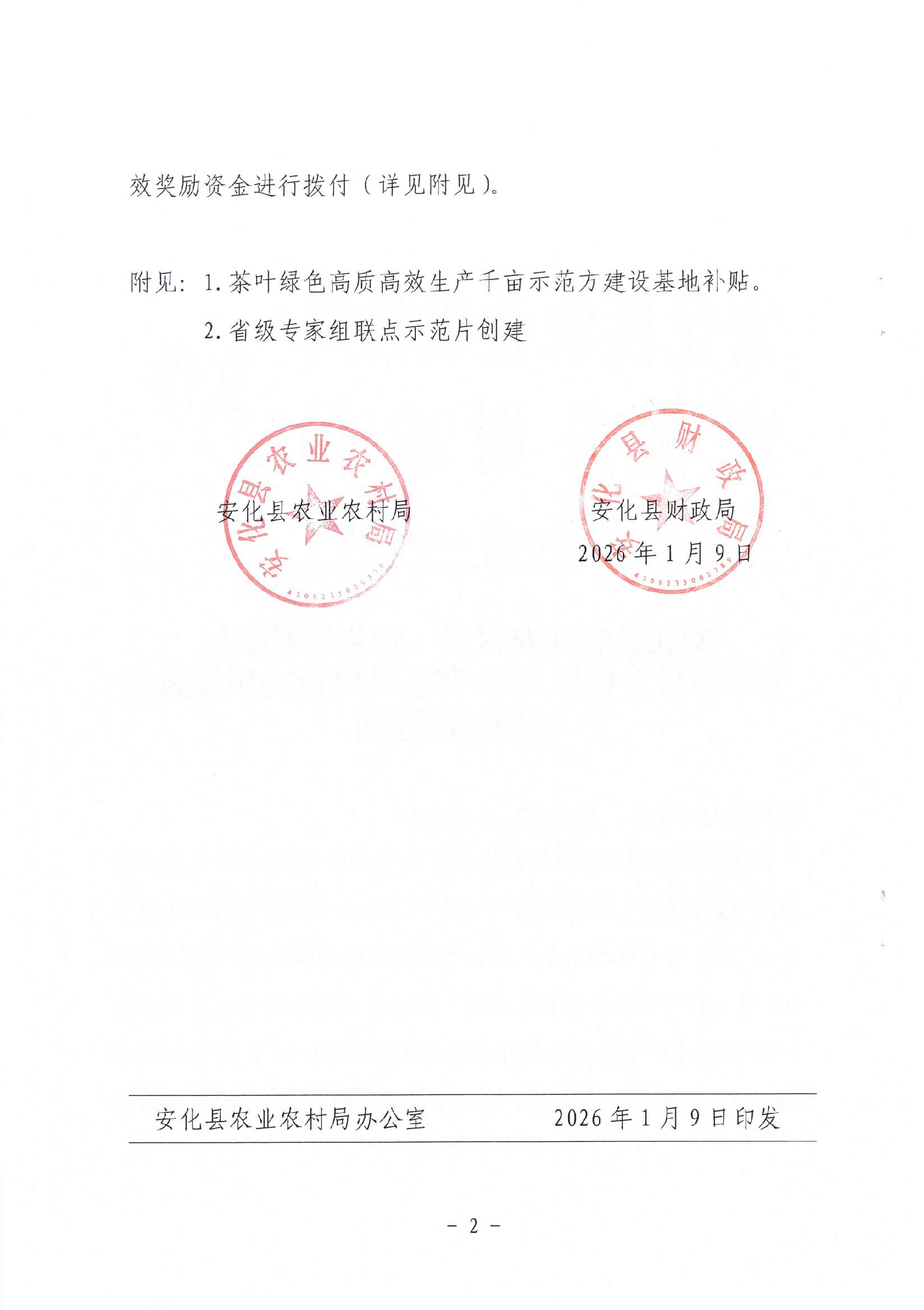 安化县农业农村局 安化县财政局 关于拨付安化县2025年茶叶绿色高质高效奖励资金的通知
