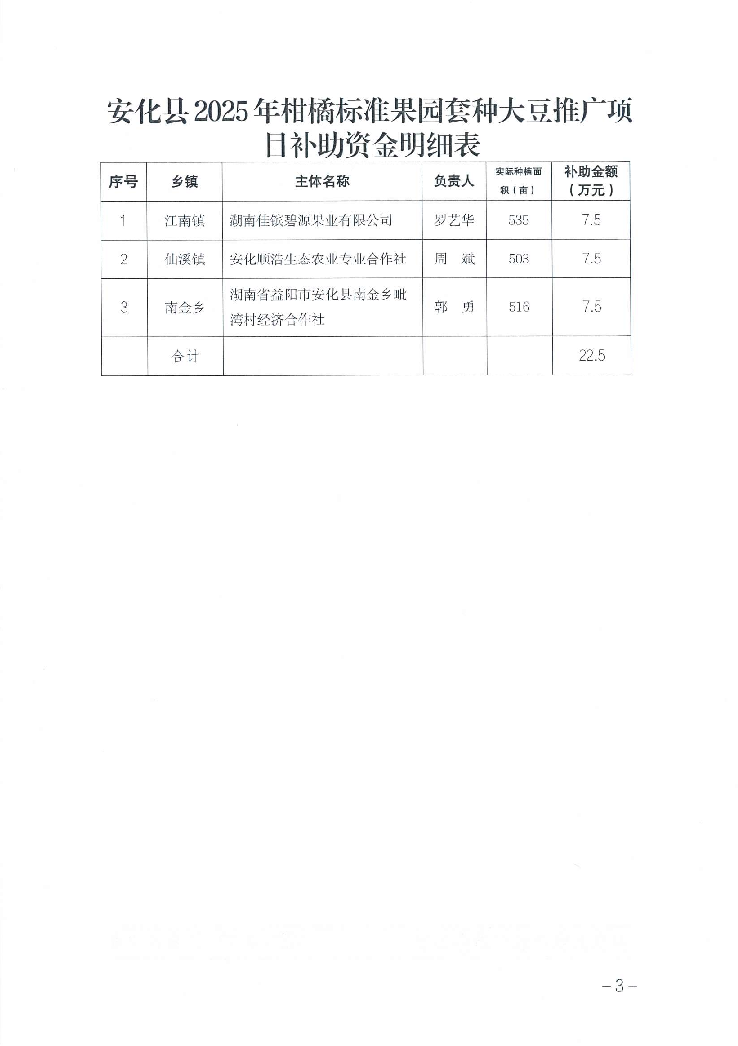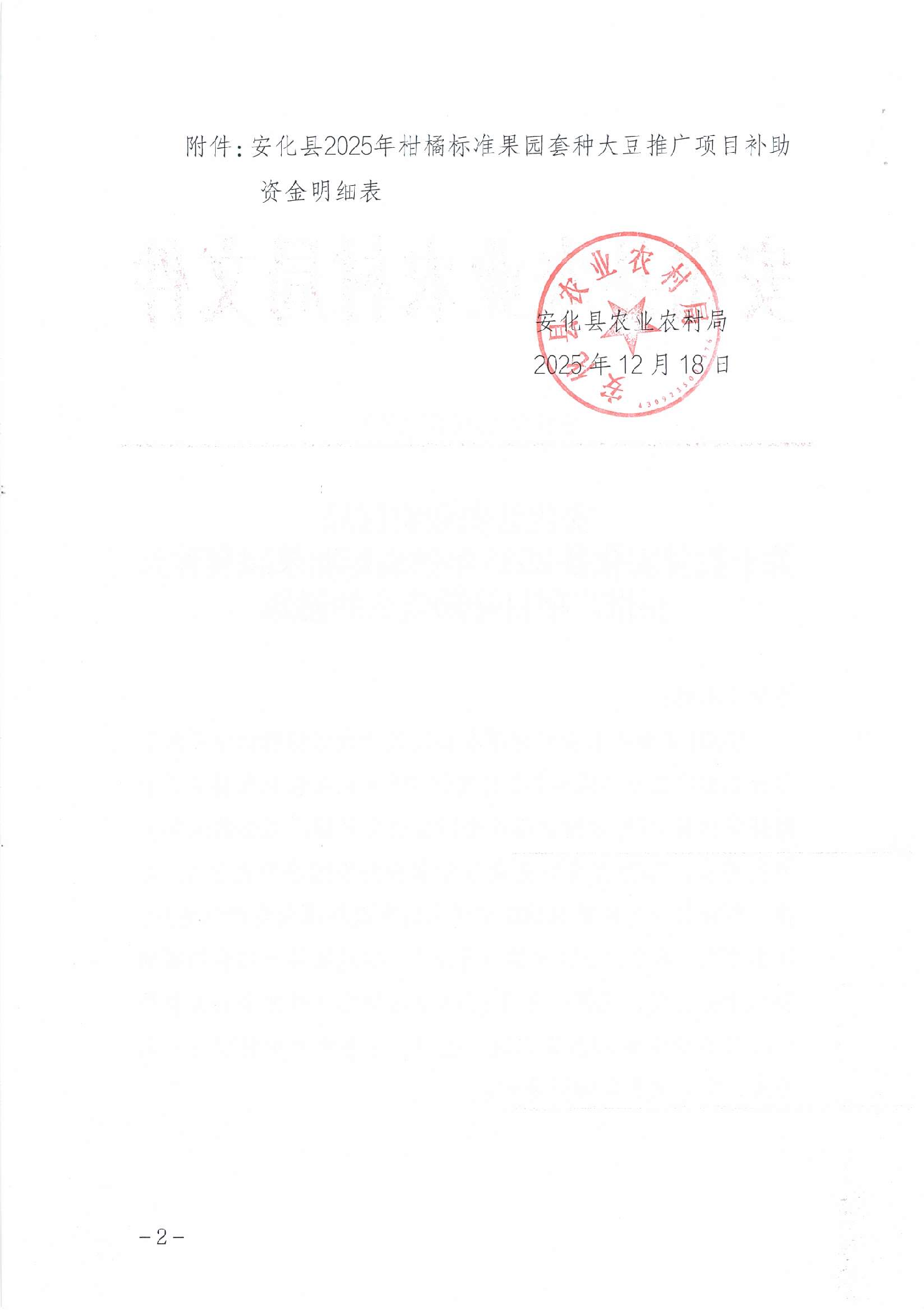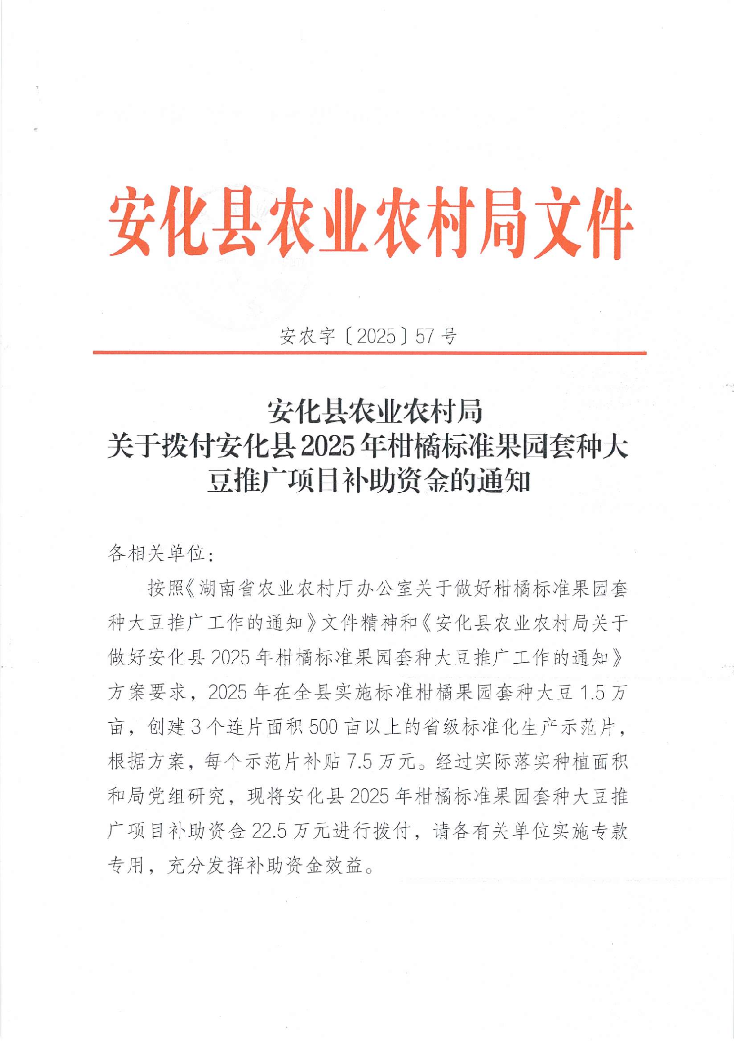安化县农业农村局 关于拨付安化县2025年柑橘标准果园套种大豆推广项目补助资金的通知