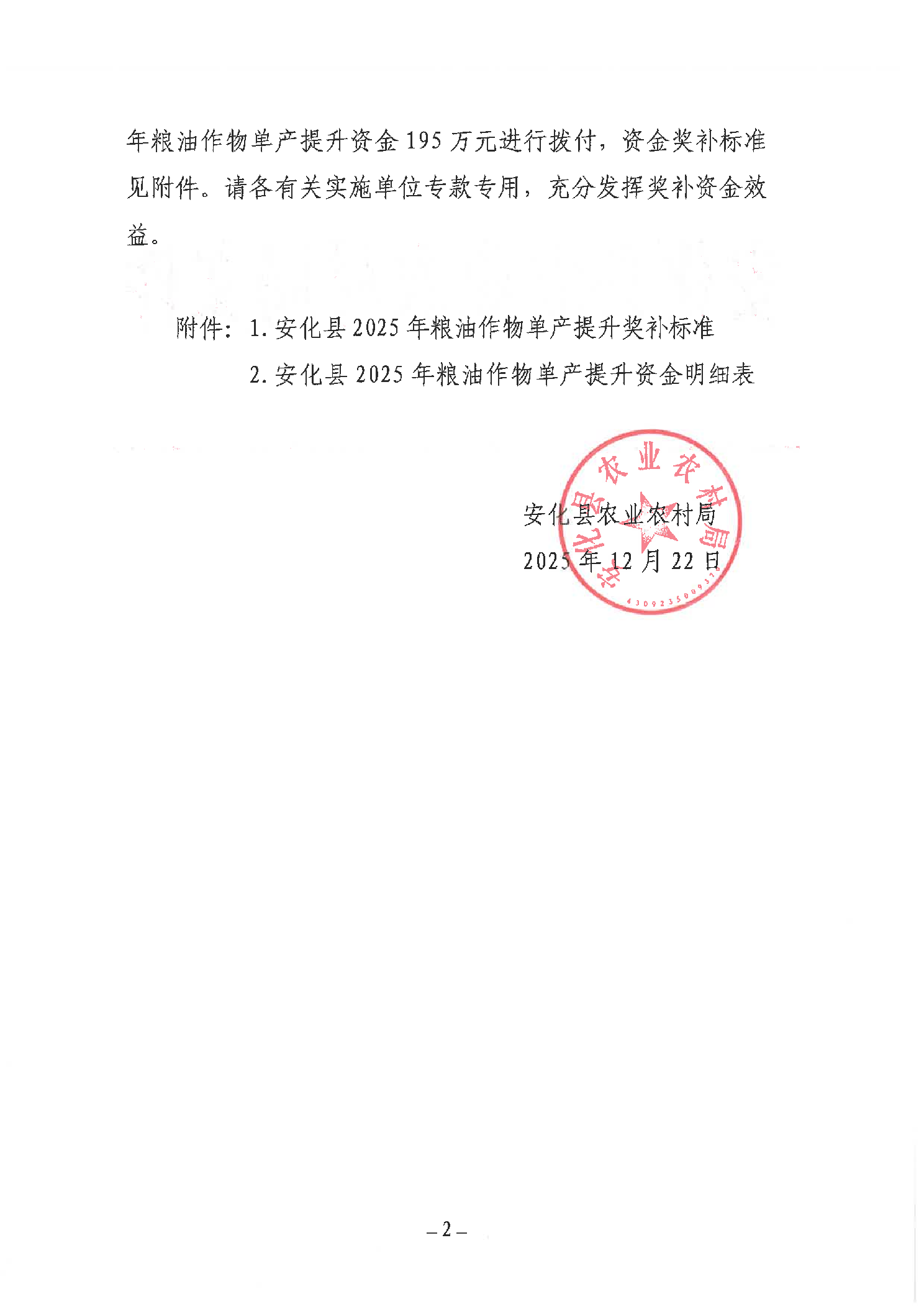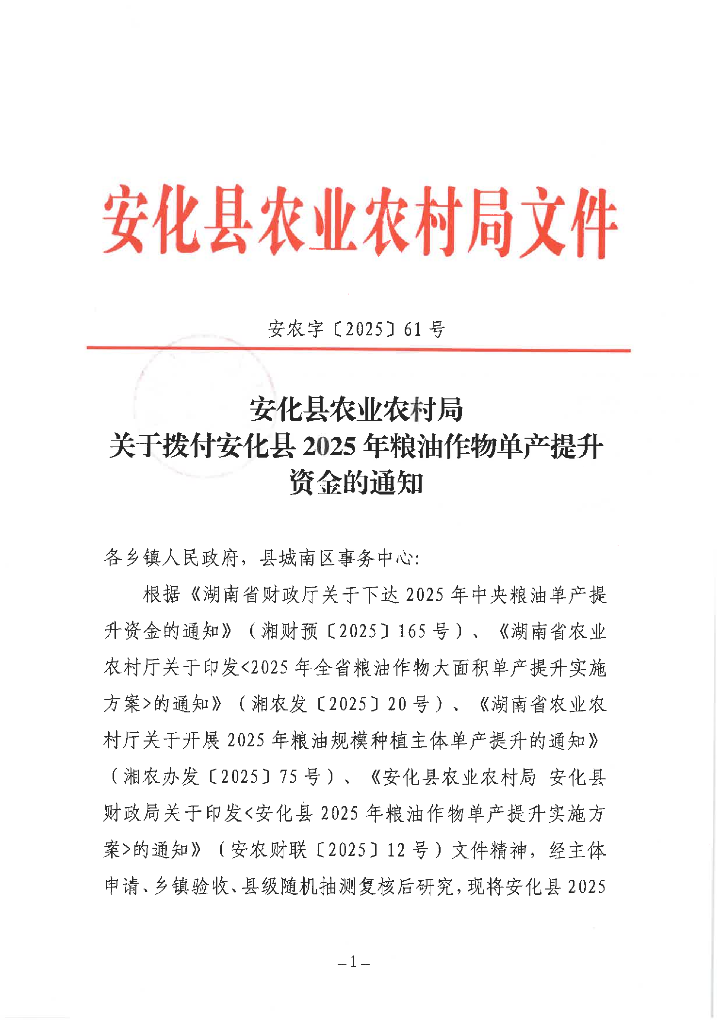 安化县农业农村局 关于拨付安化县2025年粮油作物单产提升资金的通知