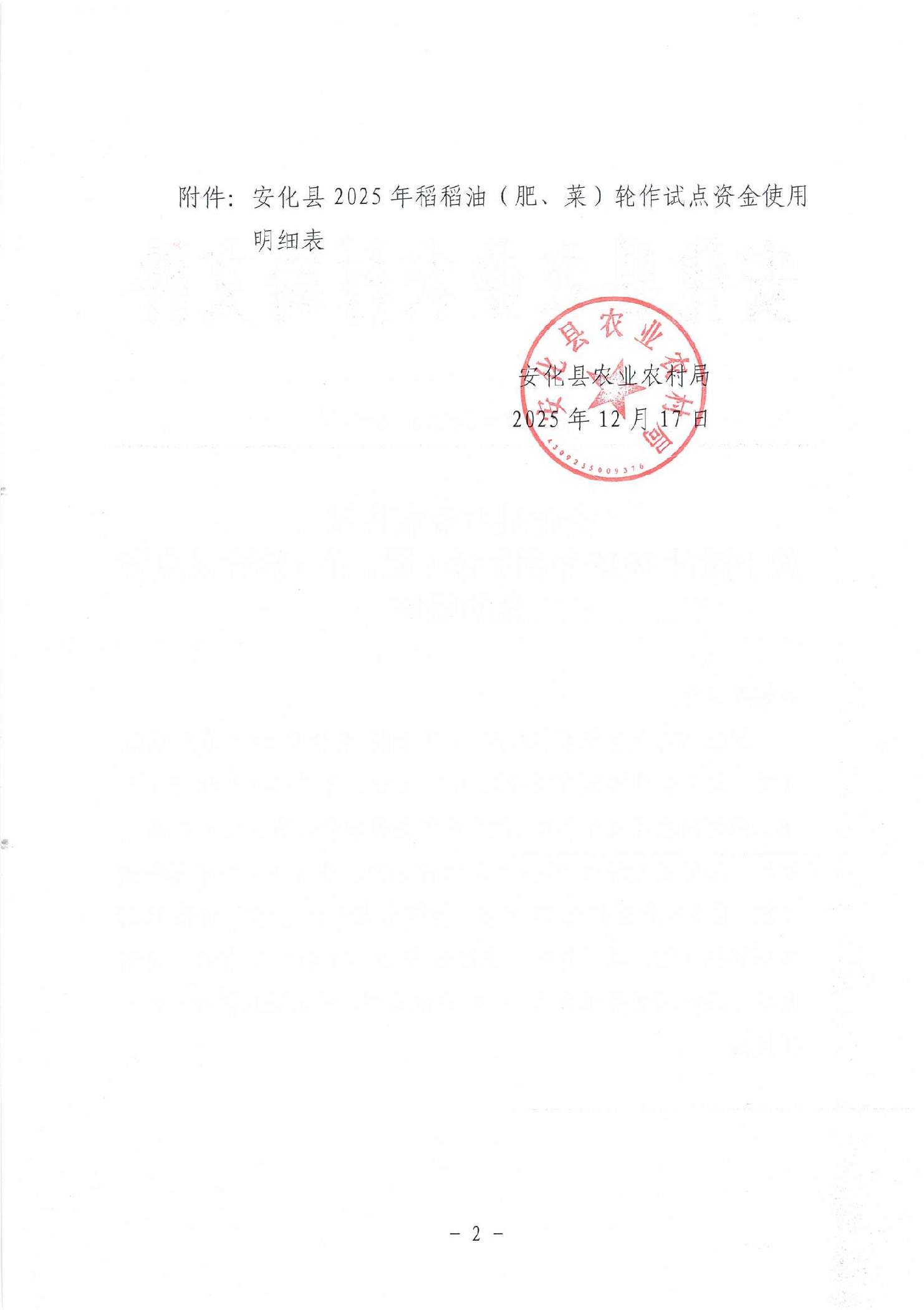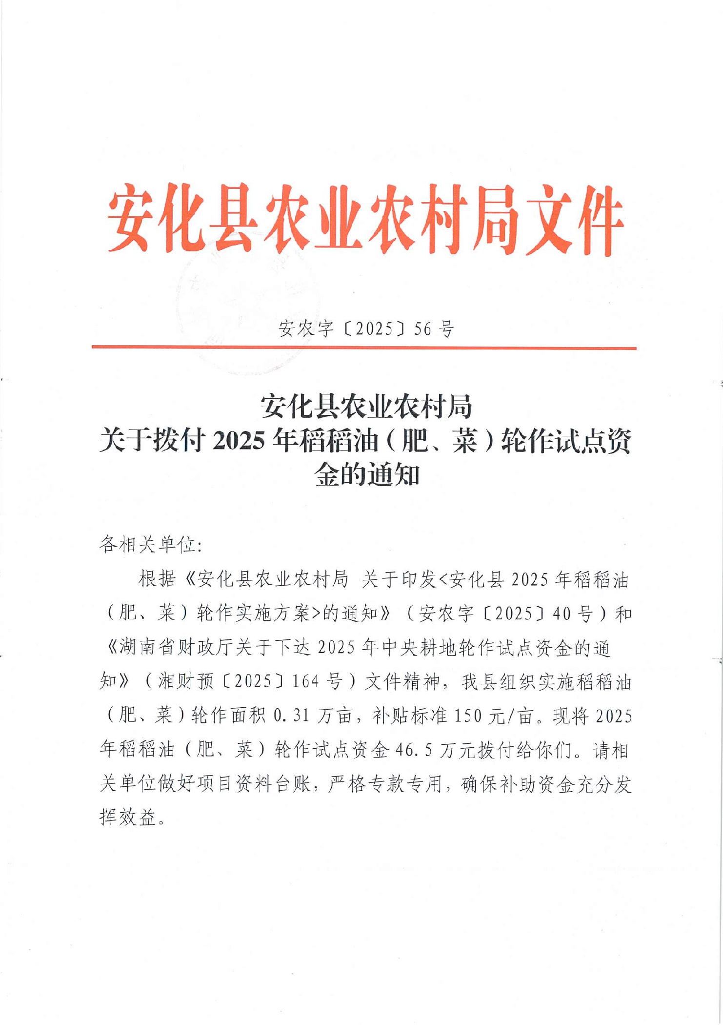 安化县农业农村局 关于拨付2025 年稻稻油(肥、菜)轮作试点资金的通知