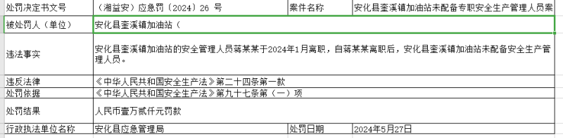 安化县奎溪镇加油站未配备专职安全生产管理人员案