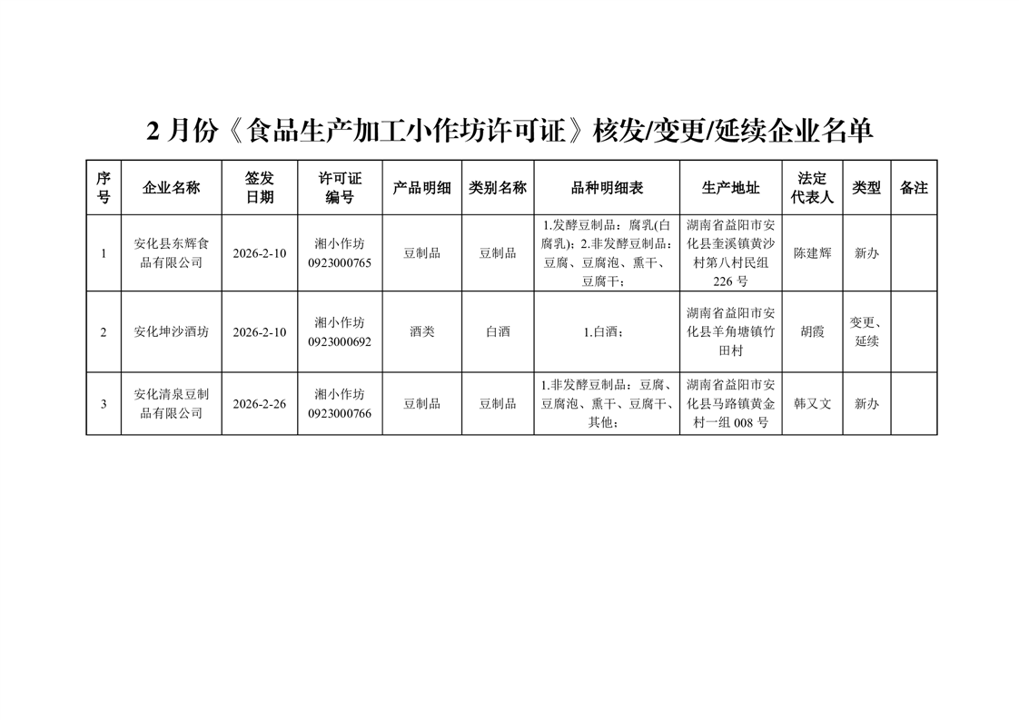 安化县市场监督管理局 2026年第2期《食品生产加工小作坊许可证》核发/变更/延续公告