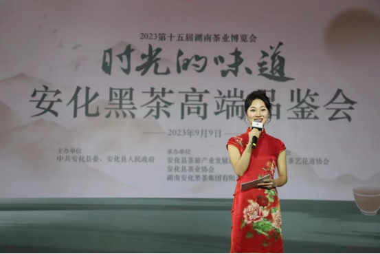9月9日下午,一场形式新颖、主题突出、别开生面的安化黑茶高端品鉴会在2023第十五届湖南茶博会主会场举行。出席“时光的味道”安化黑茶高端品鉴会的有中国工程院院士、湖南农业大学学术委员会主任、教授刘仲华,湖南省人大常委会原副主任叶红专,湖南省供销合作总社原一级巡视员欧程远,益阳市人民政府副市长何军田,湖南省茶叶技术体系首席专家张曙光、湖南省茶业协会会长周重旺,湖南省茶叶学会理事长、湖南农大教授肖力争,湖南省委宣传部(省文资委)驻安化县对口帮扶工作组组长禹丹,县人民政府党组成员、副县长杨正华等领导、专家及经销商、茶友、新闻媒体。活动由茶频道主持人莫倩倩主持。