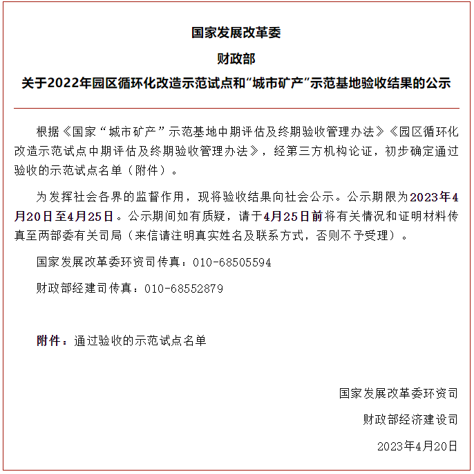 日前,国家发展改革委、财政部公示了2022年园区循环化改造示范试点和“城市矿产”示范基地验收结果,安化经开区纳入园区循环化改造示范试点名单。