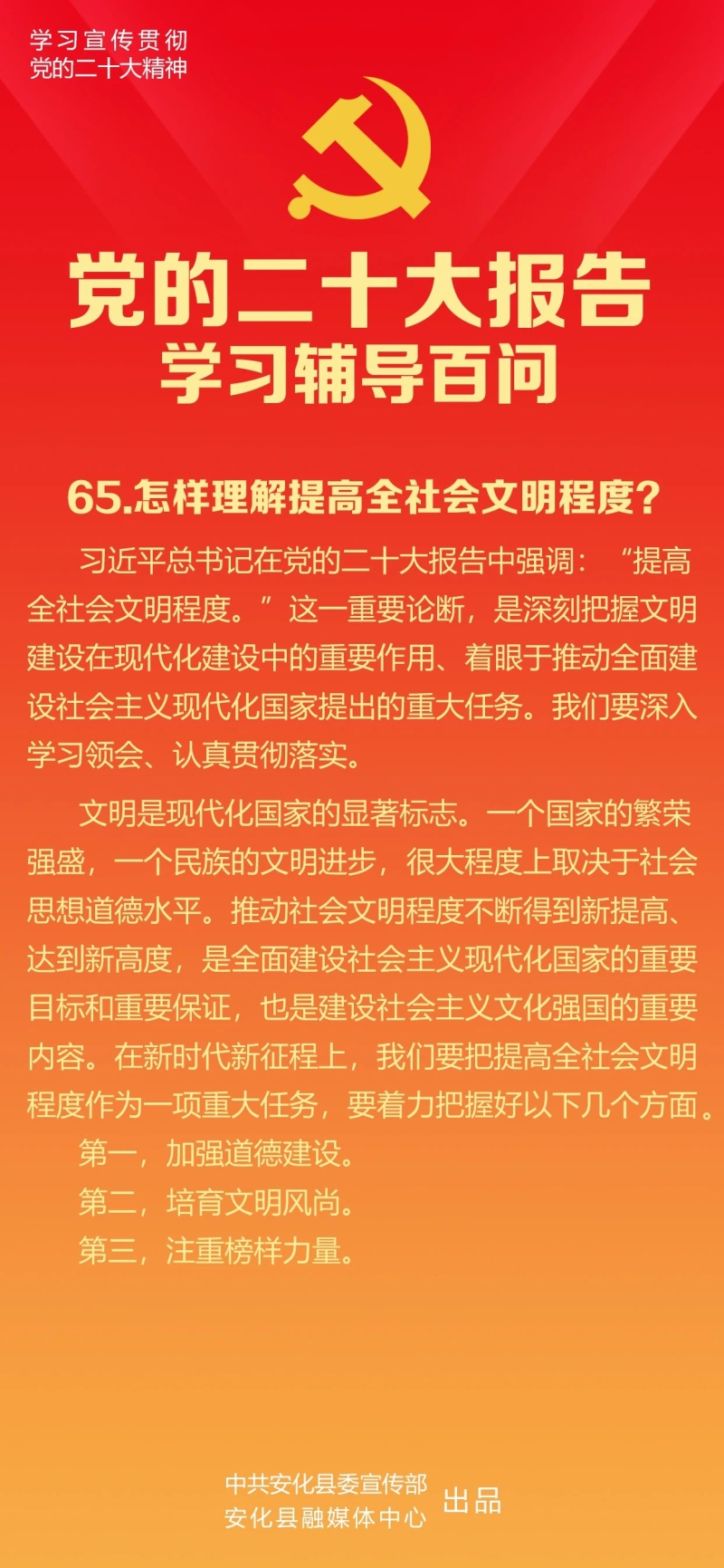 第二,培育文明风尚。衡量社会文明程度高低,很重要的是看文明风尚、精神风貌、人文氛围。要把开展群众性精神文明创建活动作为提升国民素质和社会文明程度的有效途径,以实施文明创建工程为抓手,统筹推动文明培青、文明实践、文明创建,深化文明城市、文明村镇、文明单位、文明家庭、文明校园创建工作,推进城乡精神文明建设融合发展。要大力加强农村精神文明建设,深入挖掘、继承、创新优秀传统乡土文化,弘扬新风正气,推进移风易俗,培育文明乡风、良好家风、淳朴民风,焕发乡村文明新气象。要在全社会弘扬劳动精神、奋斗精神、奉献精神、创造精神、勤俭节约精神,培青时代新风新貌。加强国家科普能力建设,深化全民阅读活动。完善志愿服务制度和工作体系,广泛开展志愿服务关爱行动,使我为人人、人人为我在全社会蔚然成风。弘扬诚信文化,健全诚信建设长效机制。