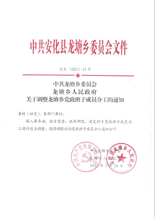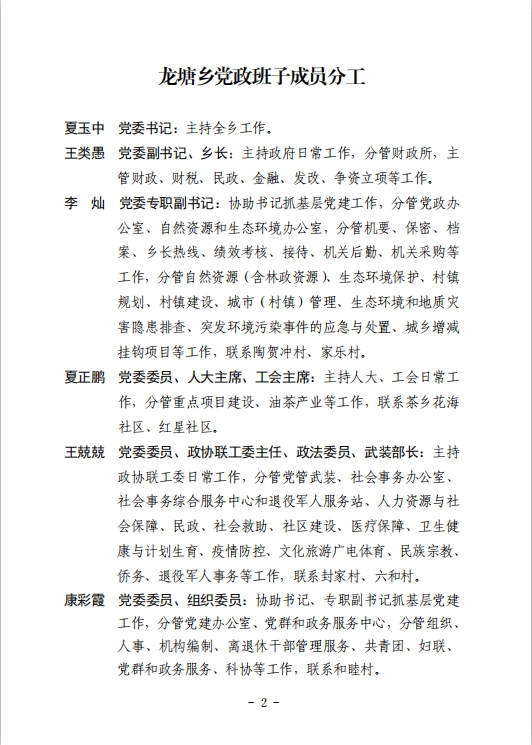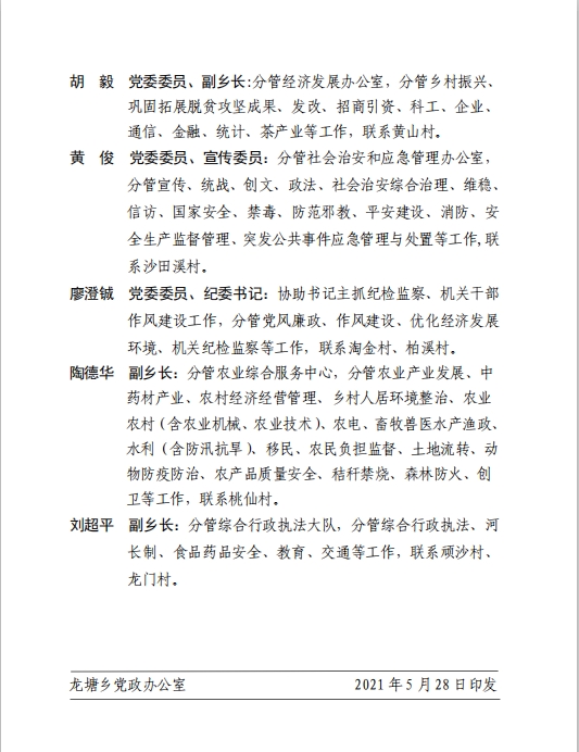 龙塘乡2021年党政班子成员分工