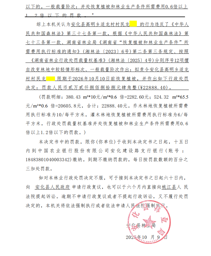 安化县林业局林业行政处罚决定书 安林罚决字(高)〔2025〕第001号